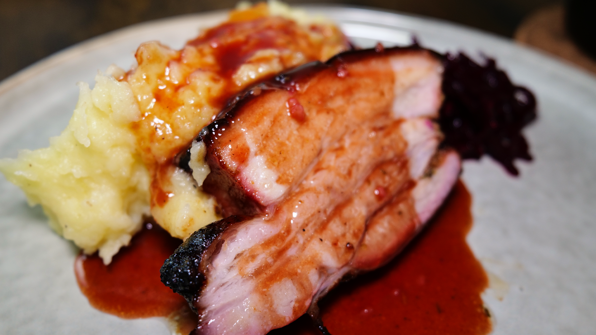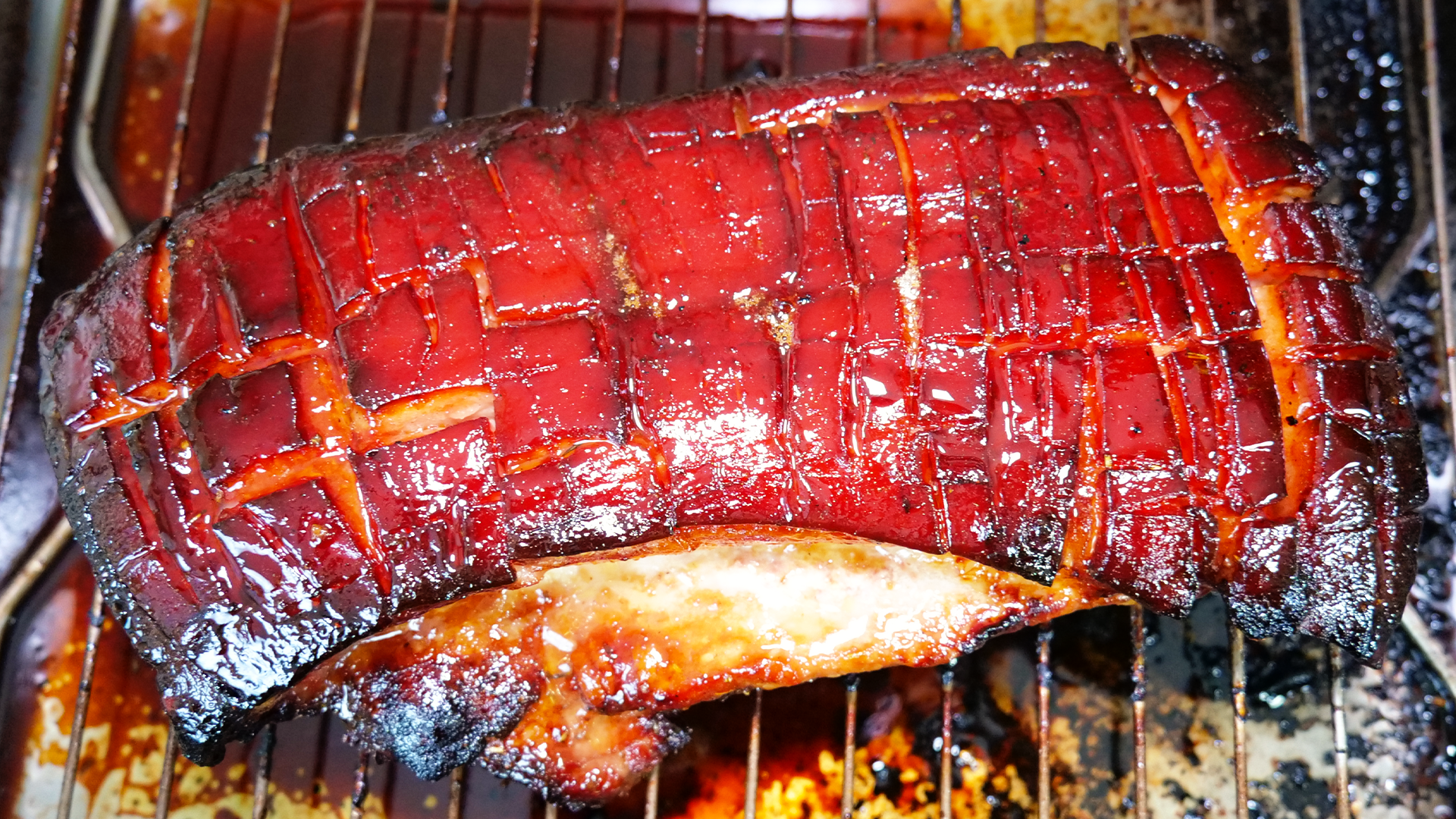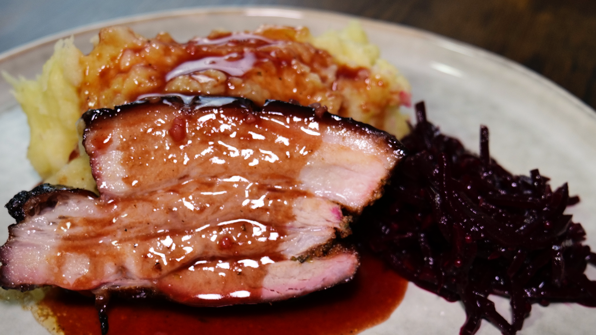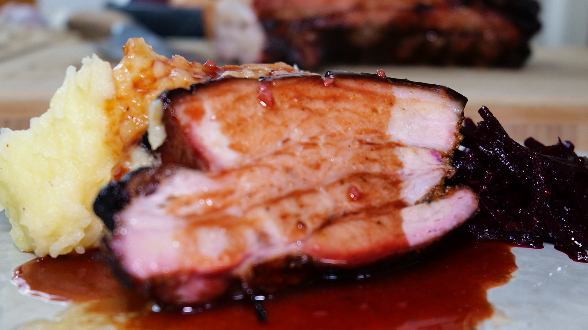 Schweinebauch mit Honig-Rum-Kirsch-Glasur vom Kamado
