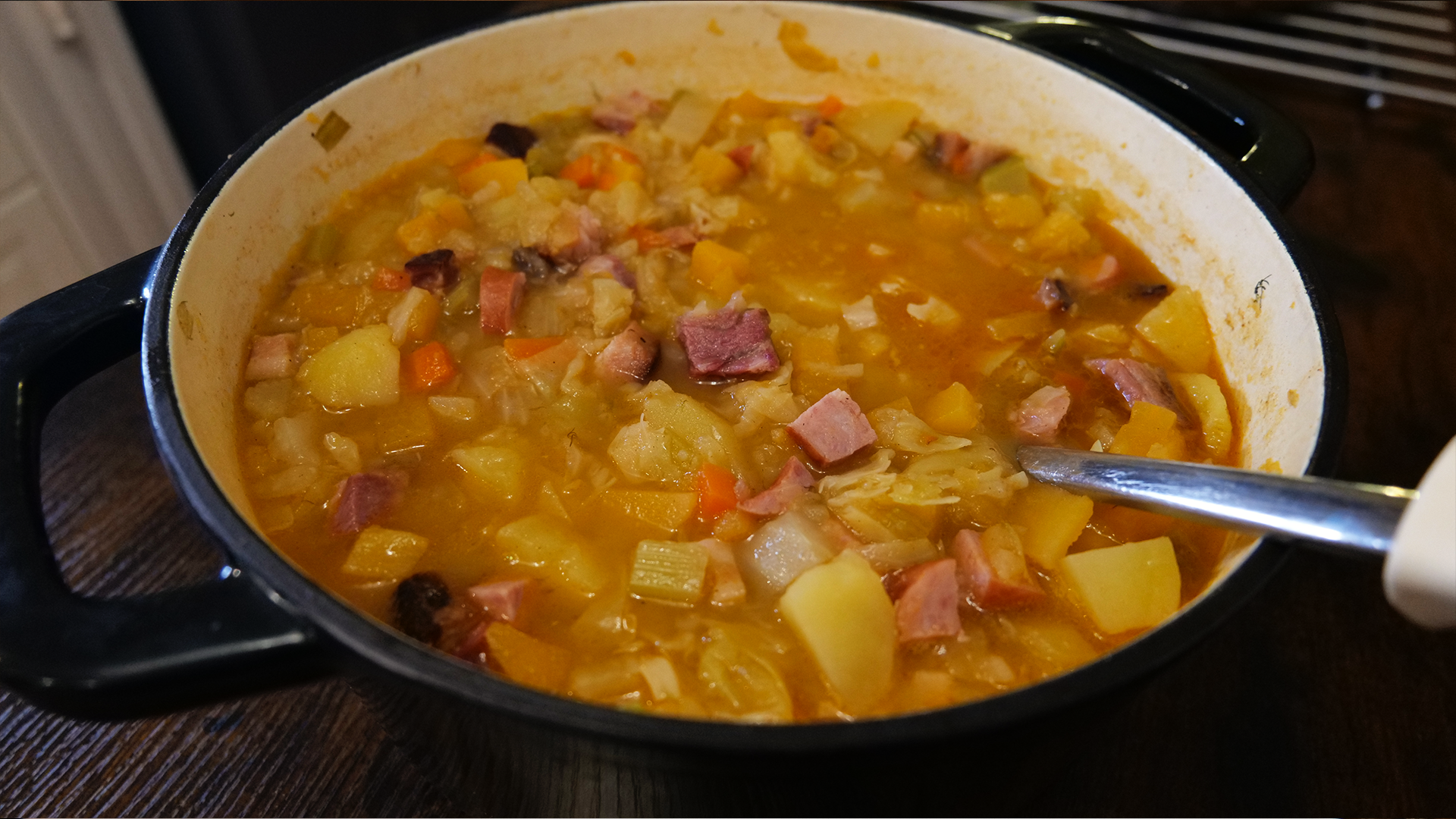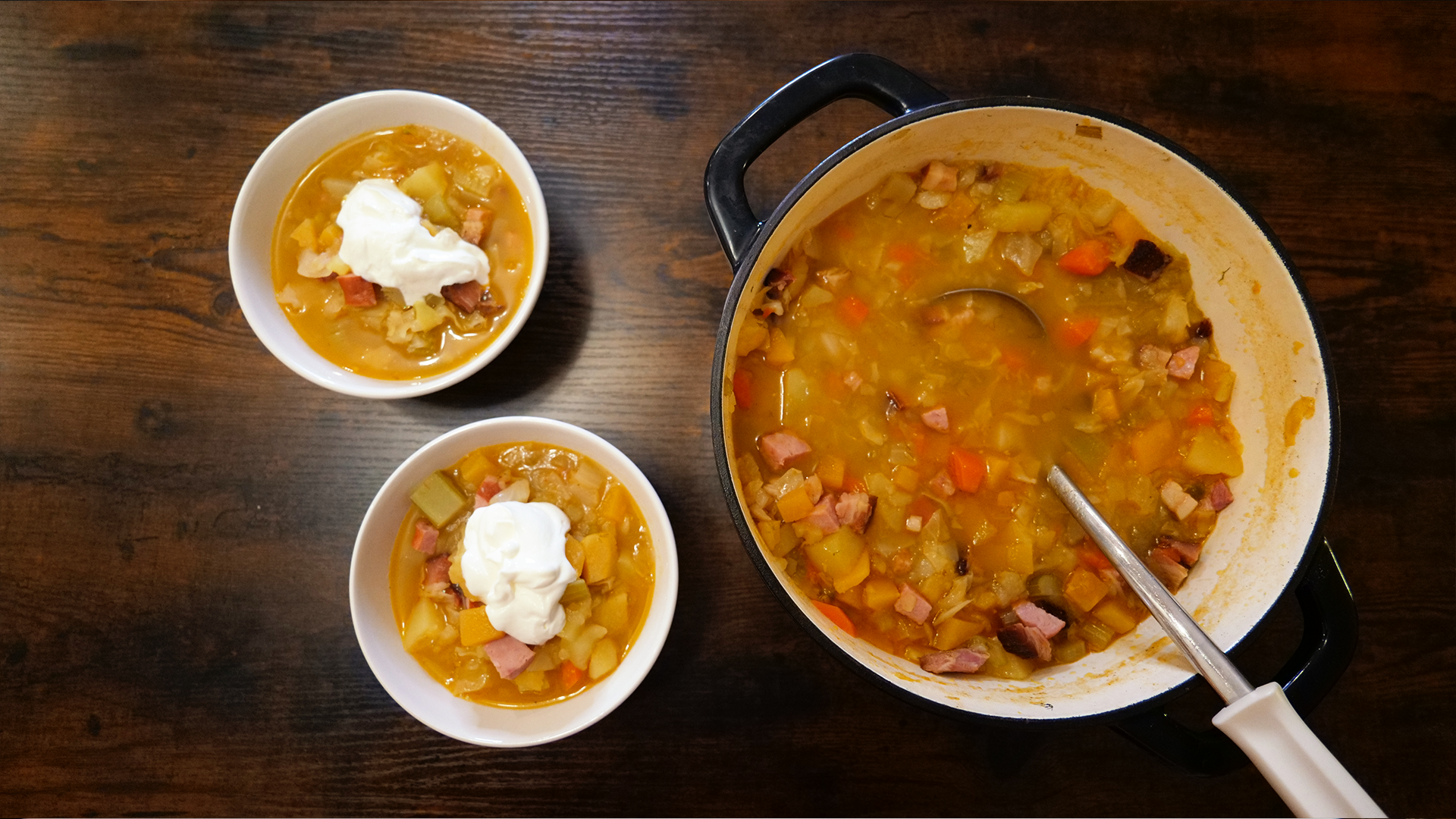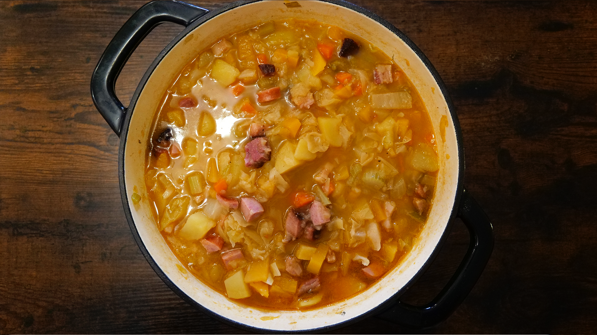 Vollgepackt mit zarter Dicker Rippe, rauchigem Speck und einer Fülle an Wintergemüse wie Steckrübe, Kartoffeln und Spitzkohl, ist dieses Rezept ein wahrer Genuss.