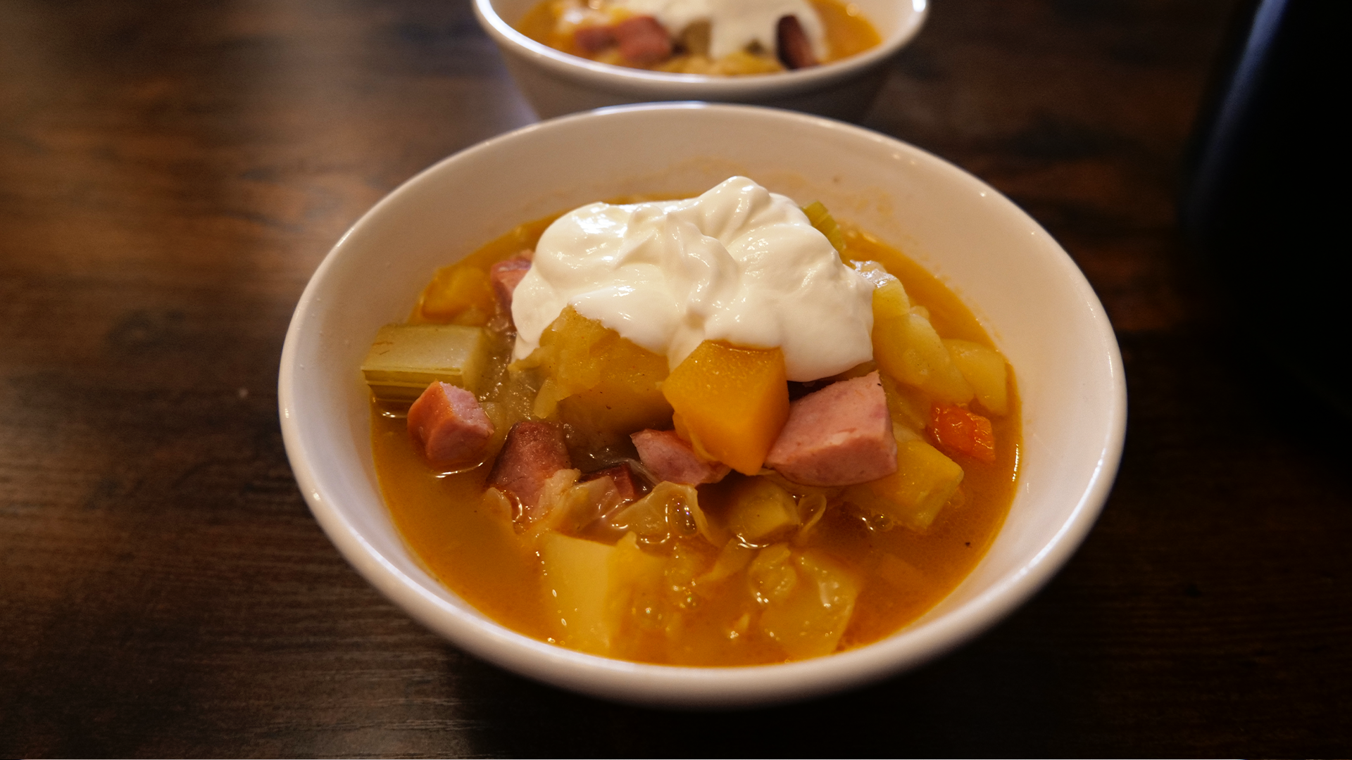 Den Eintopf in eine Bowl oder einen tiefen Teller geben und einen EL saure Sahne als Topping oben drauf geben.
