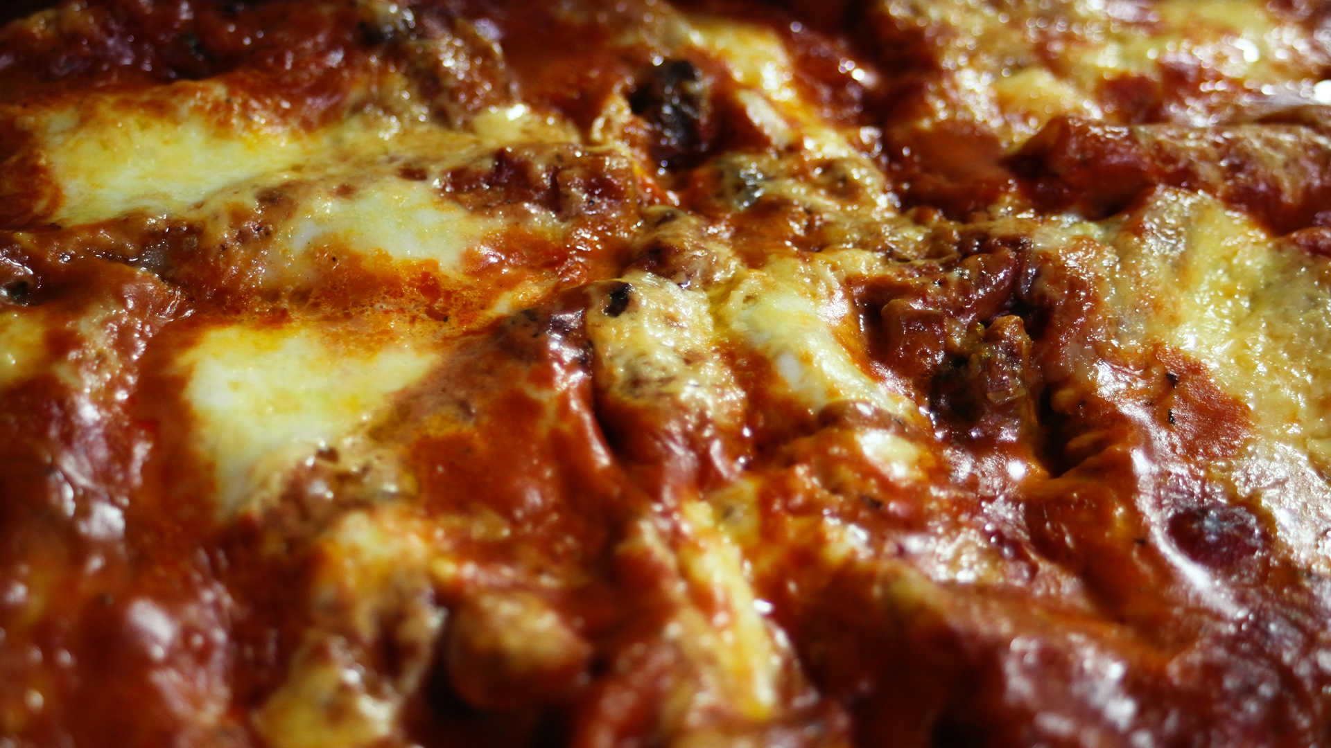 7. Mit Parmesan und optional Mozzarella bestreuen und bei 180 °C Umluft (200 °C Ober-/Unterhitze) ca. 35–40 Minuten goldbraun überbacken.