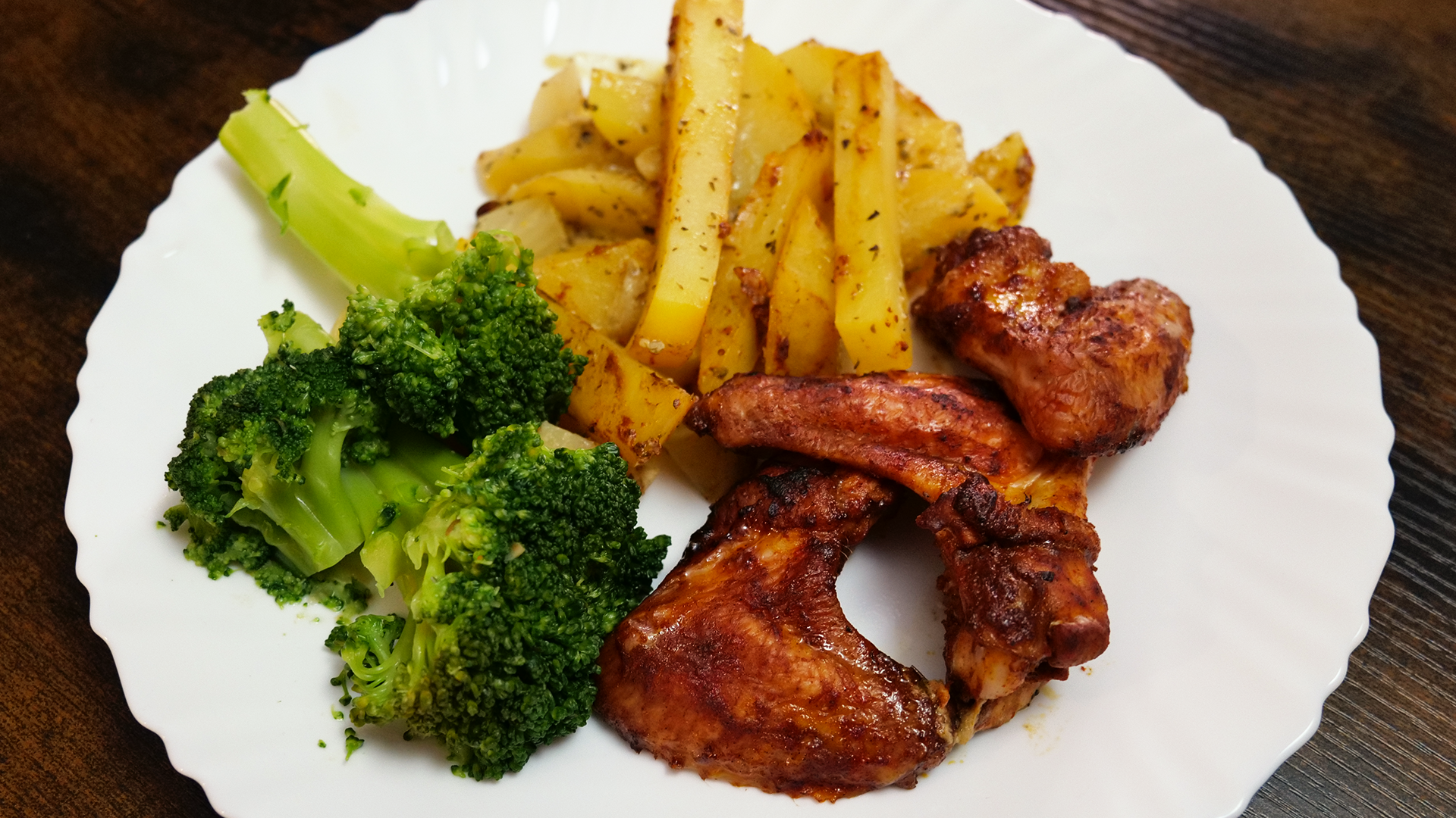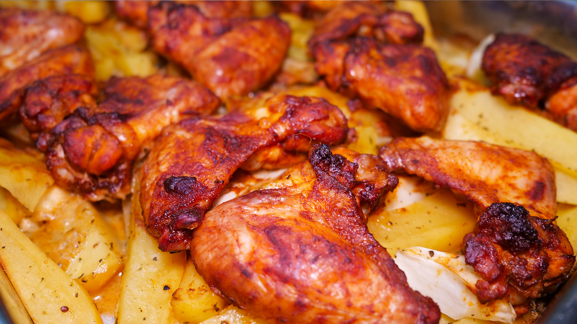 Die Garzeit kann je nach Dicke der Wings und gewünschter Knusprigkeit variieren. Das Fleisch sollte durchgegart und die Kartoffeln weich und leicht gebräunt sein.