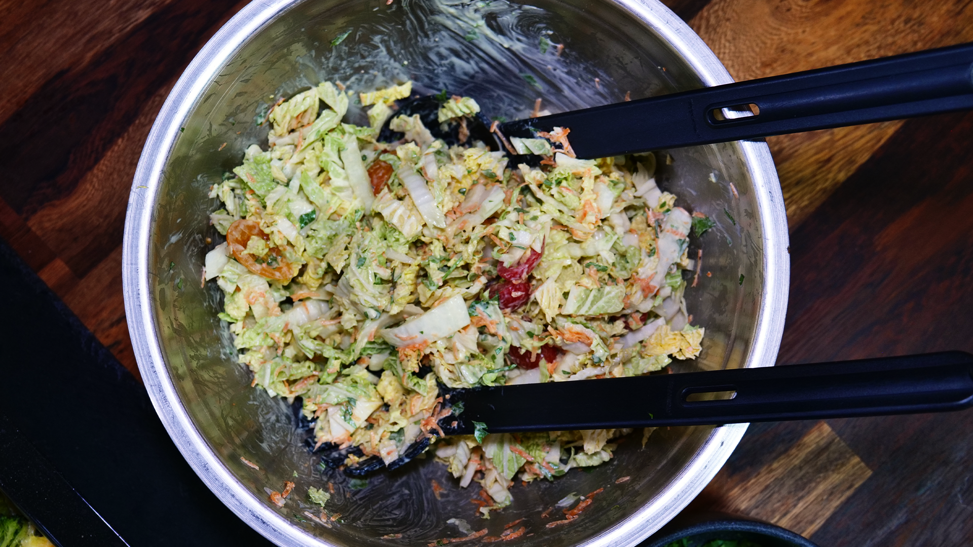 1. Chinakohl vierteln, Strunk entfernen und in Streifen schneiden. Karotten reiben und Tomaten halbieren. Alles in eine Salatschüssel geben.