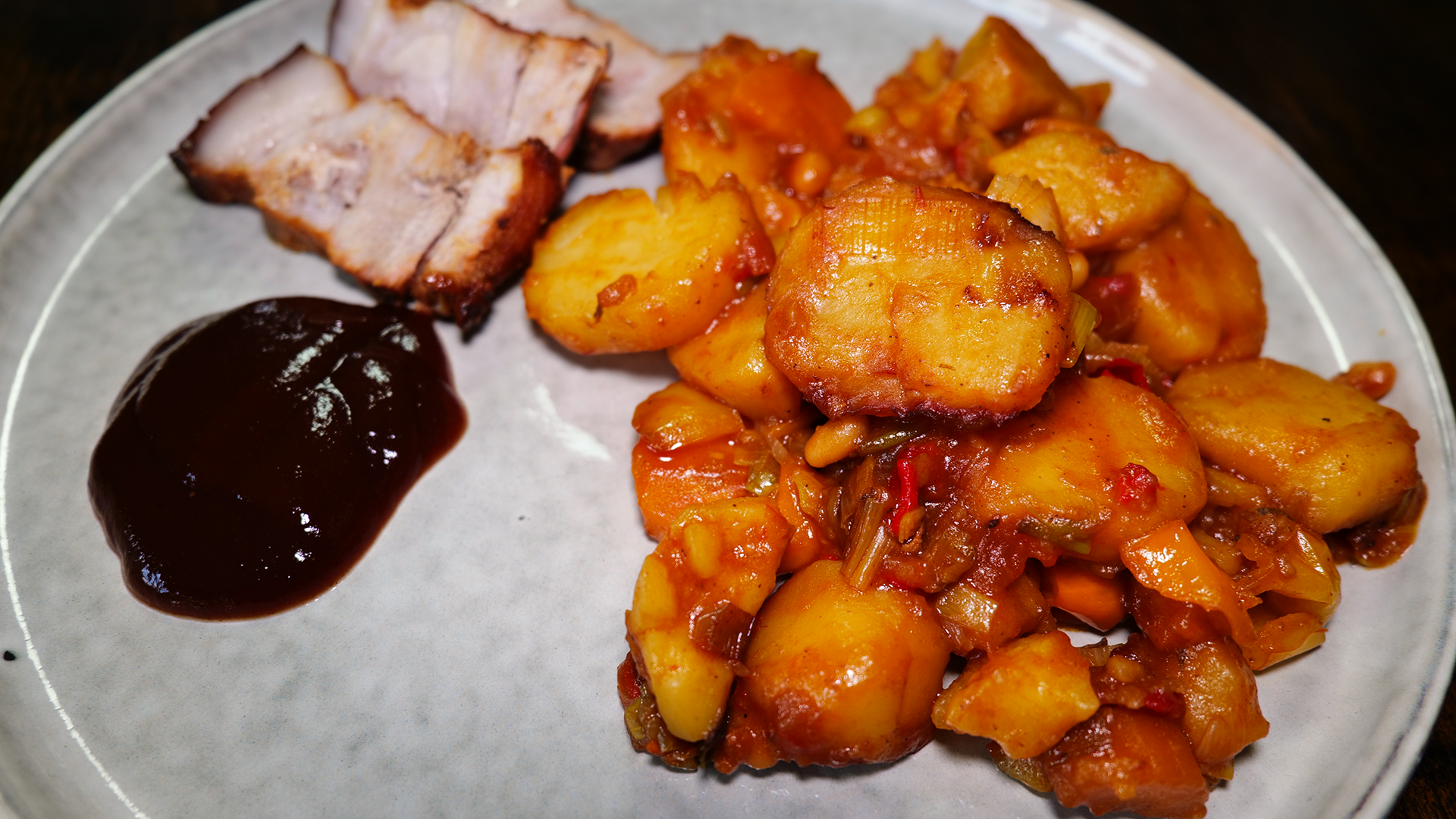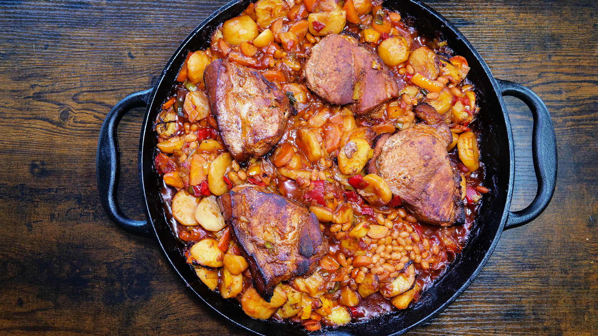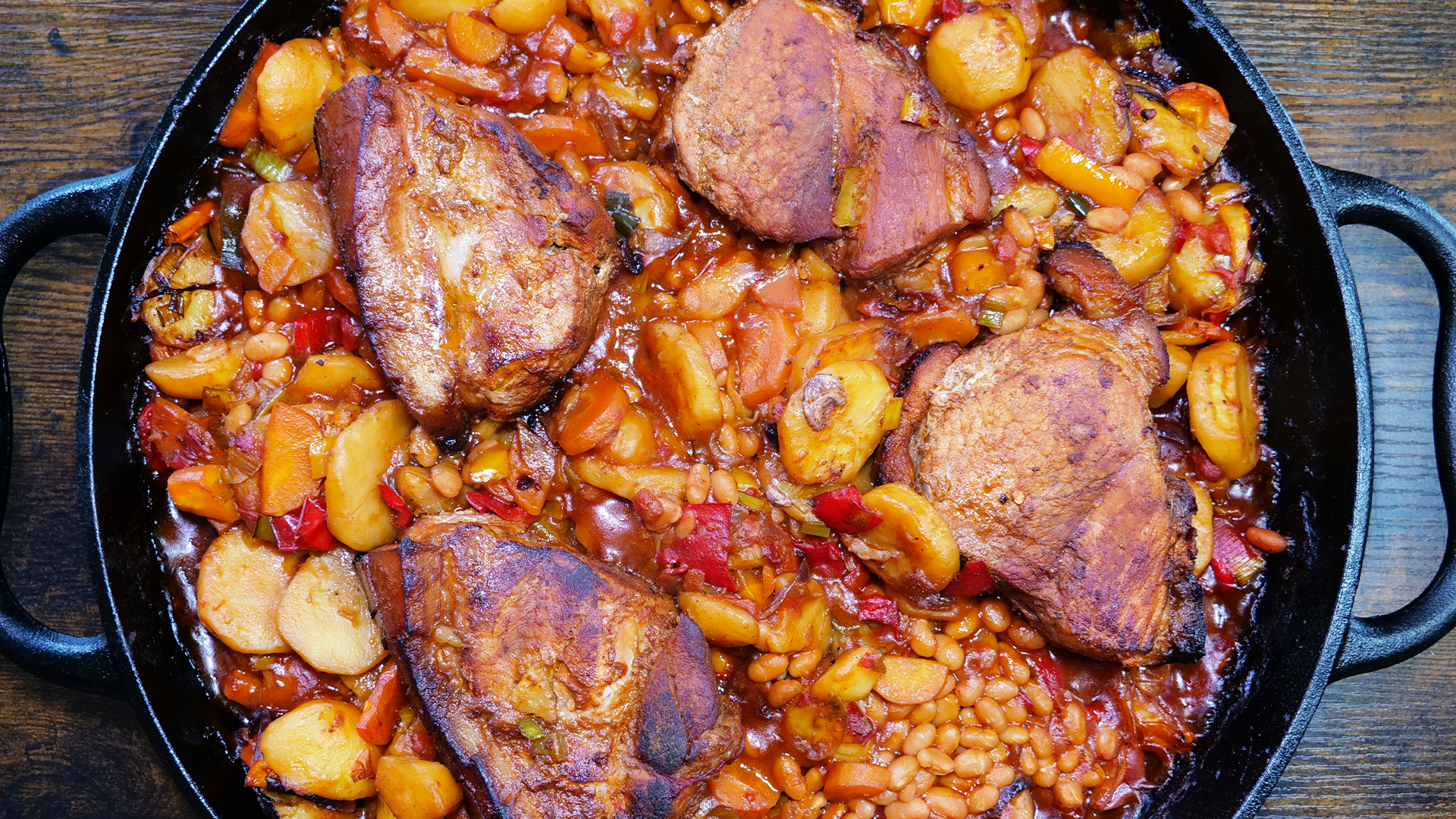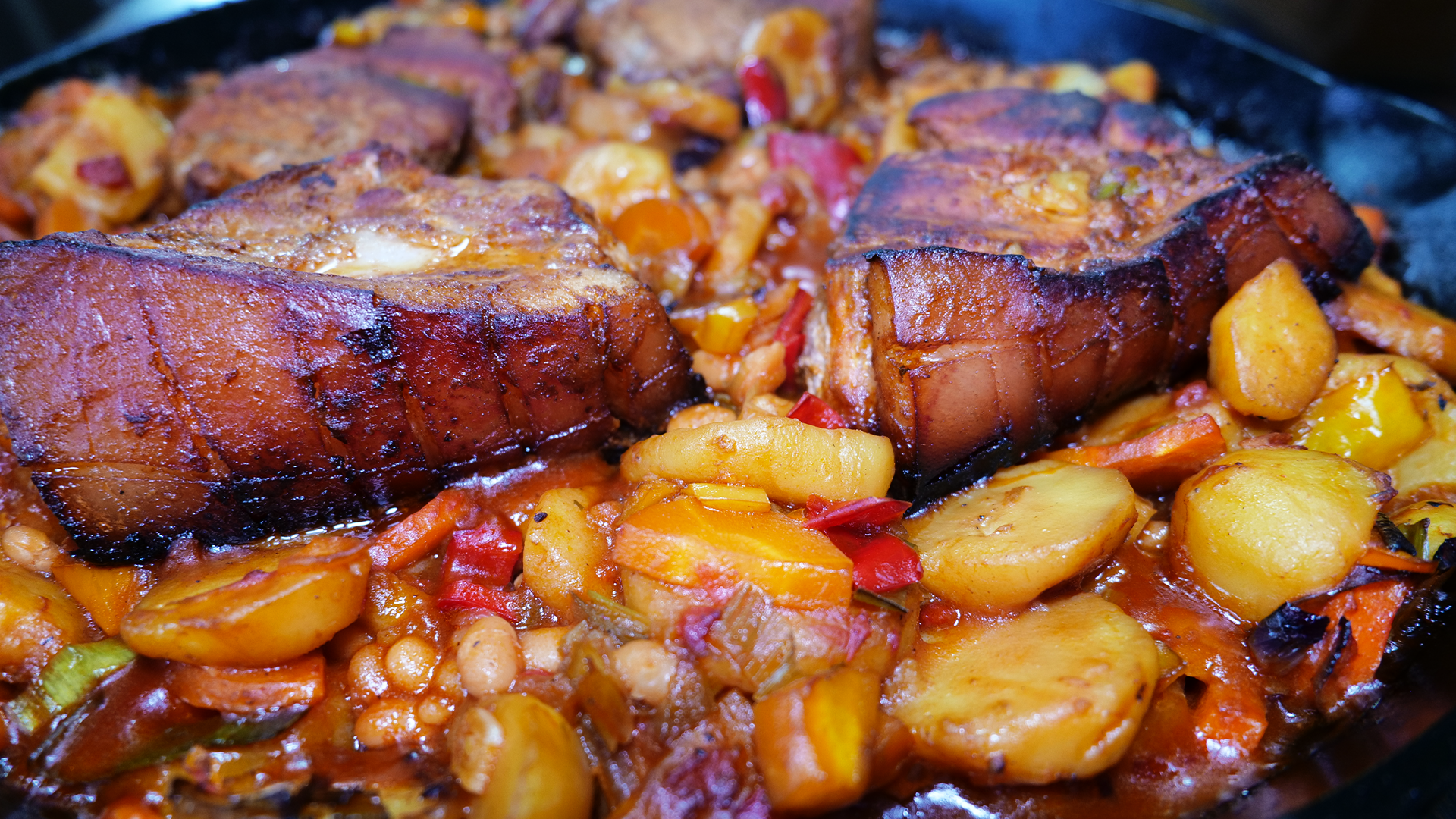 Der Feuerbraten – Balkan Roast Reloaded ist ein echtes Highlight für alle, die ihren Kamado lieben! Zart geschmortes Schweinefleisch trifft auf Paprika, Kartoffeln, Ajvar und gebackene Bohnen – alles in einer gusseisernen Pfanne. Durch das Anbraten über direkter Hitze bekommt das Fleisch unvergleichliche Röstaromen, bevor es auf einem bunten Gemüsebett im geschlossenen Grill sanft schmort. Perfekt für ein rustikales Outdoor-Essen mit Balkan-Flair.