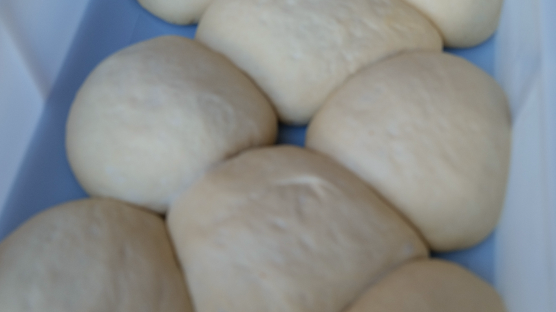 Den Teig zudecken und an einem warmen Ort 2-3 Stunden gehen lassen, bis das Volumen sich mindestens verdoppelt hat. Den Teig danach in gleichgroße Teigballen formen. Diese abdecken und bis zur weiteren Verwendung kalt stellen. Das hilft, den Teig zu festigen und das Ausrollen zu erleichtern.
