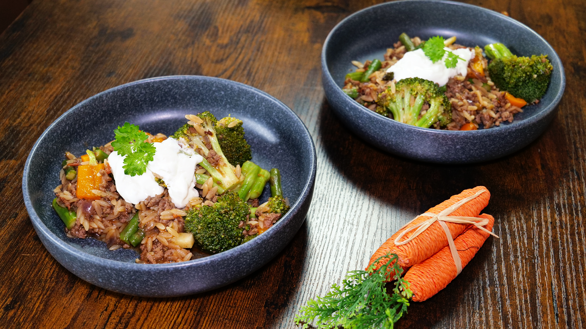 Griechische Hackfleisch-Gemüsepfanne mit Reisnudeln