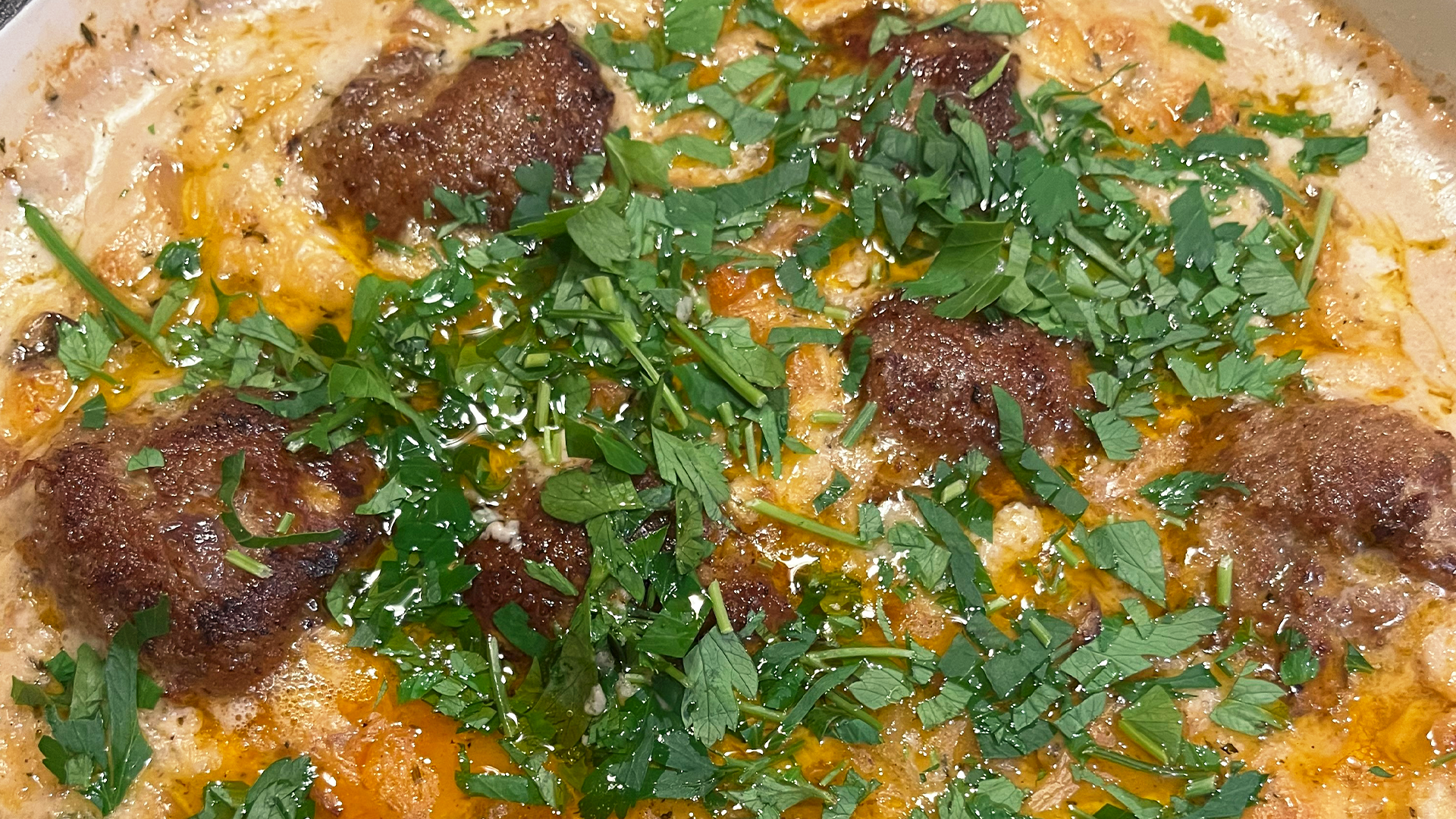 Jetzt die Hackbällchen zurück in die Pfanne zur Sauce legen und alles zusammen für etwa 30 Minuten bei 180 °C Umluft im vorgeheizten Ofen garen. Vor dem Servieren mit frisch gehackter Petersilie bestreuen.