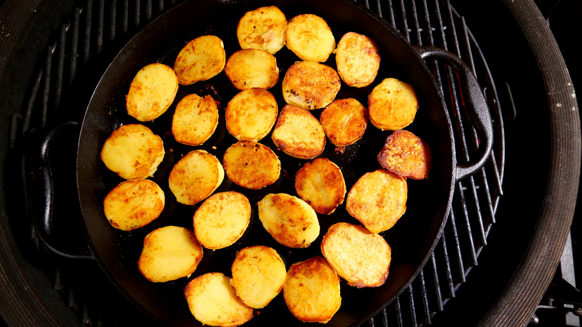 Gusseisenpfanne gut ölen, Kartoffeln fächerförmig einschichten, mit Käse bestreuen und goldgelb braten.