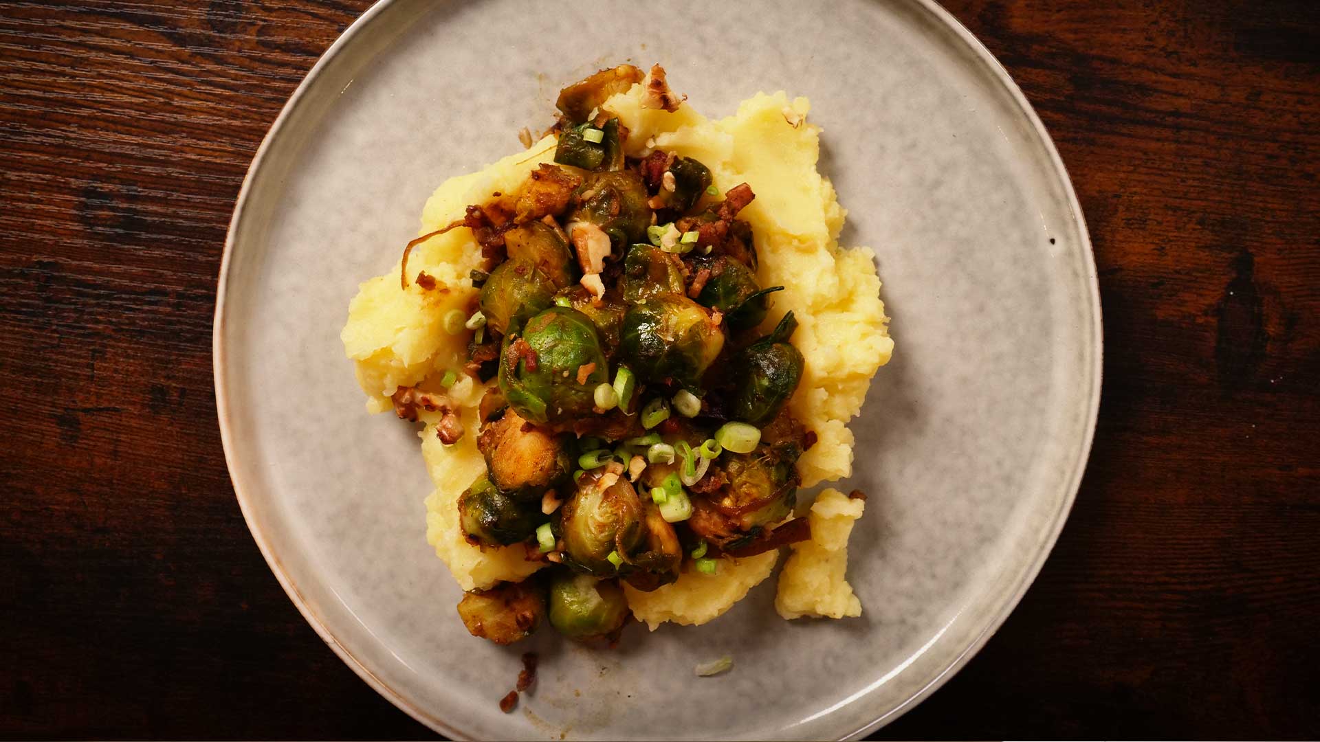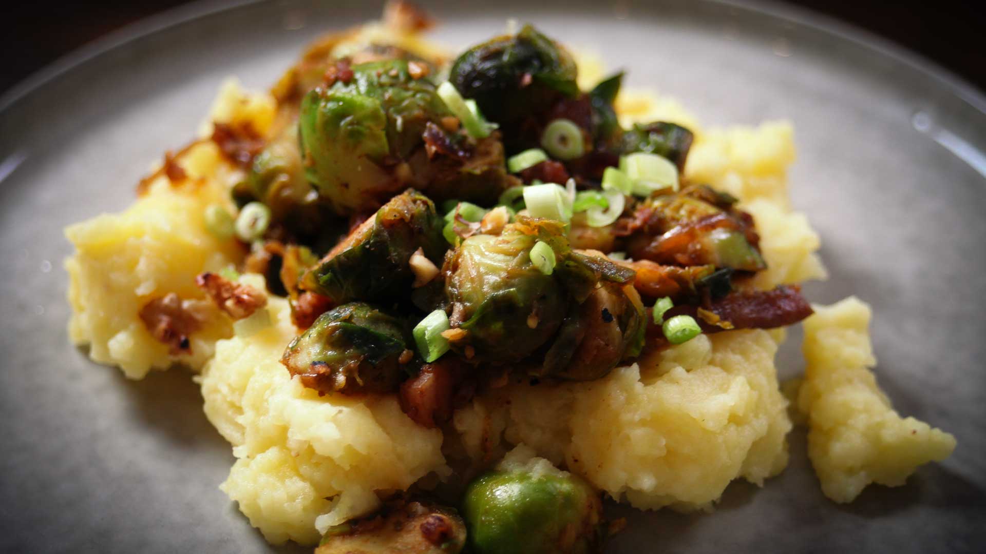 Hauptgang: Smokey Rosenkohl Crunch mit Kartoffelpüree