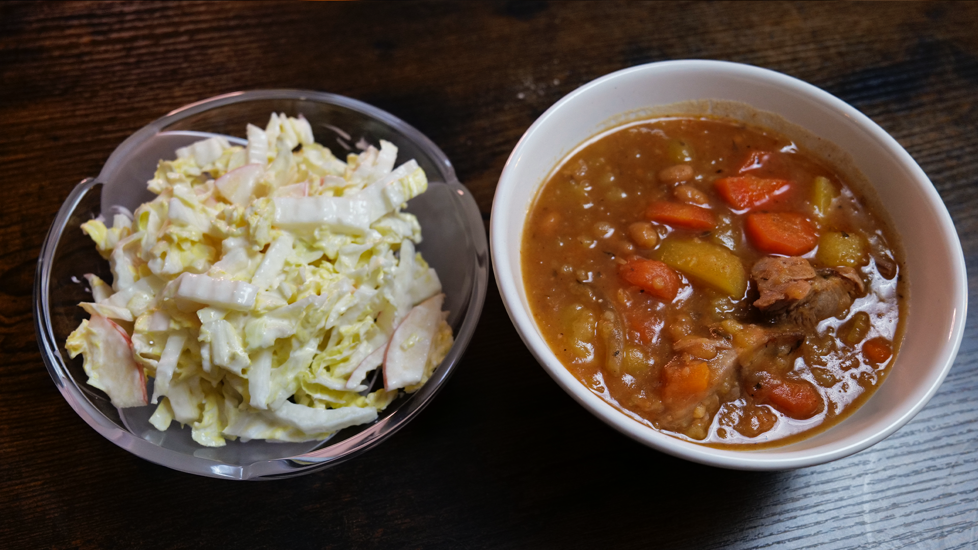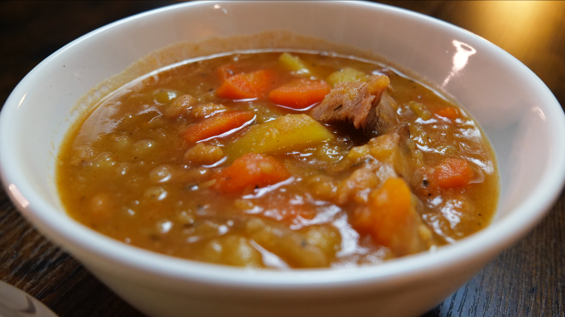 Das Gemüse und die Kartoffeln im Topf vorsichtig etwas stampfen, Fleisch wieder zugeben.