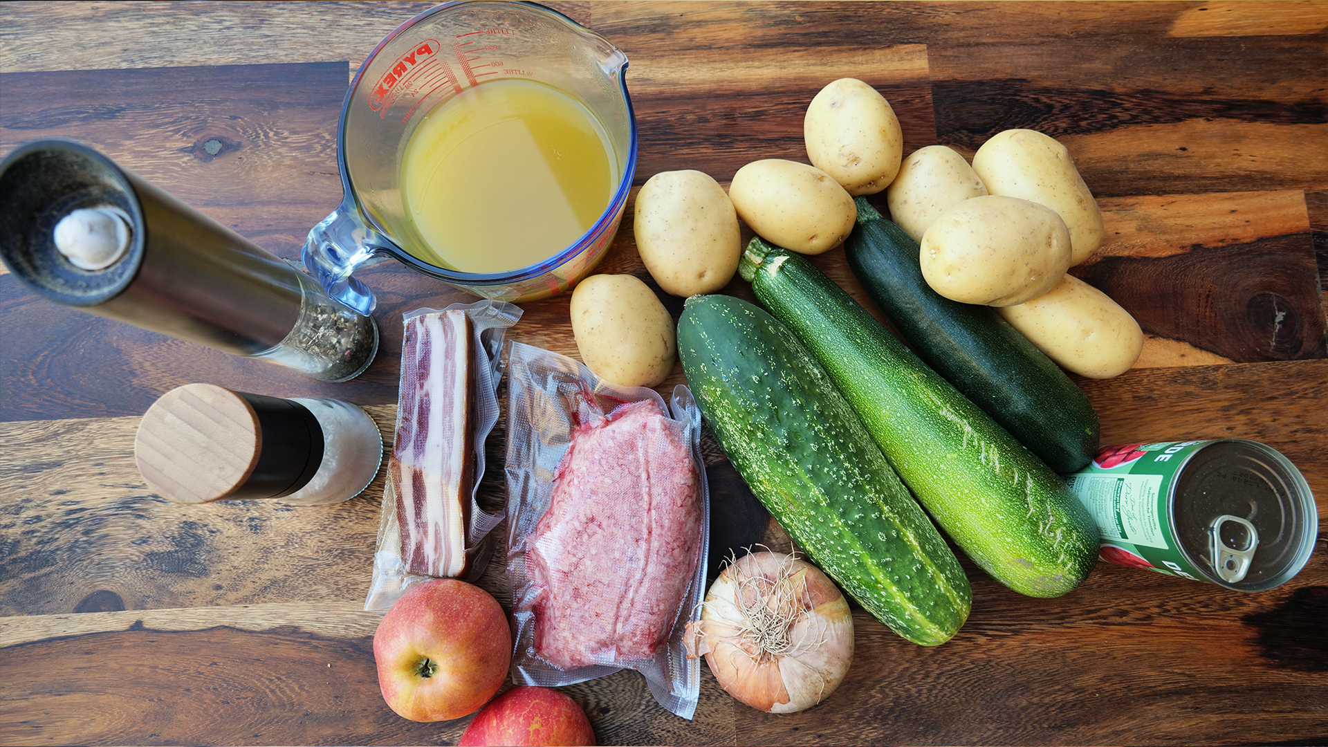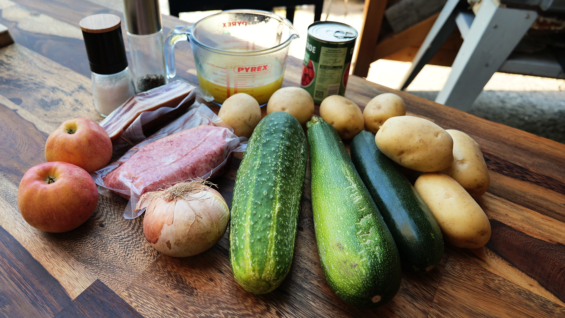 3. Erst Kartoffeln, dann Gurken, Äpfel, Tomaten (und optional Zucchini) in den Topf geben