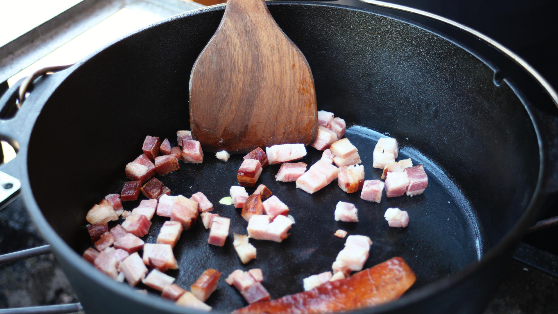 1. Speck im Topf auslassen, Hackfleisch zugeben, kräftig anbraten, Zwiebeln dazu