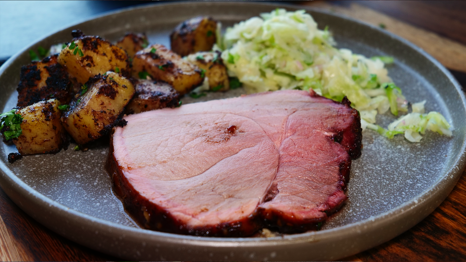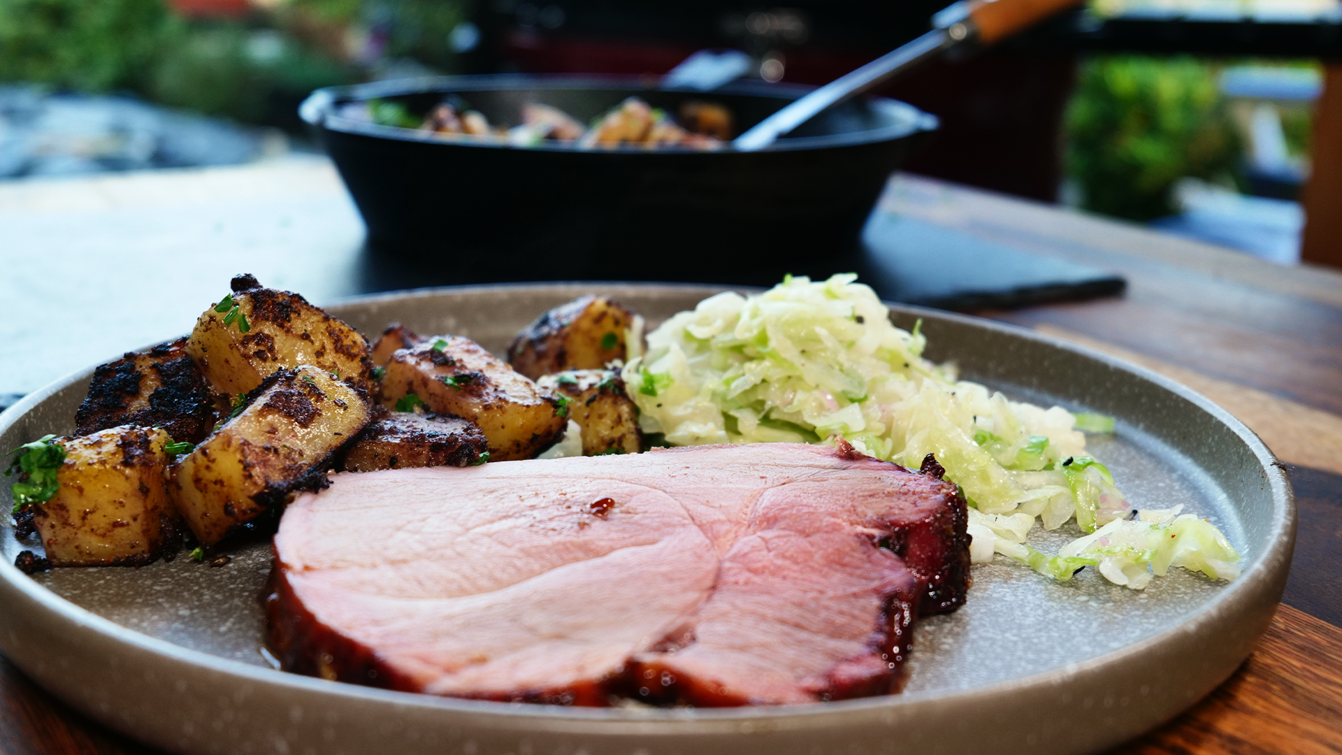 In Scheiben schneiden, mit Glasur beträufeln, dazu Kartoffeln & Krautsalat reichen.