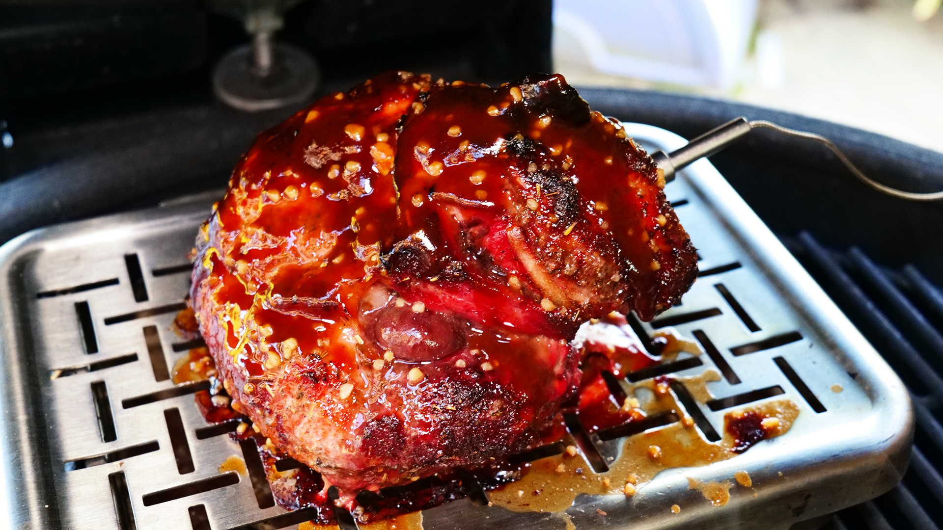 Schweinenuss auf den Rost legen und ca. 60–70 Minuten garen, bis eine Kerntemperatur von ca. 55 °C erreicht ist.