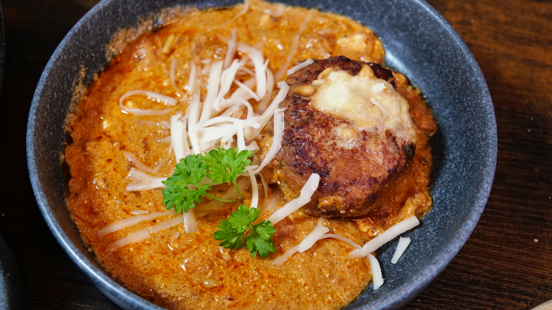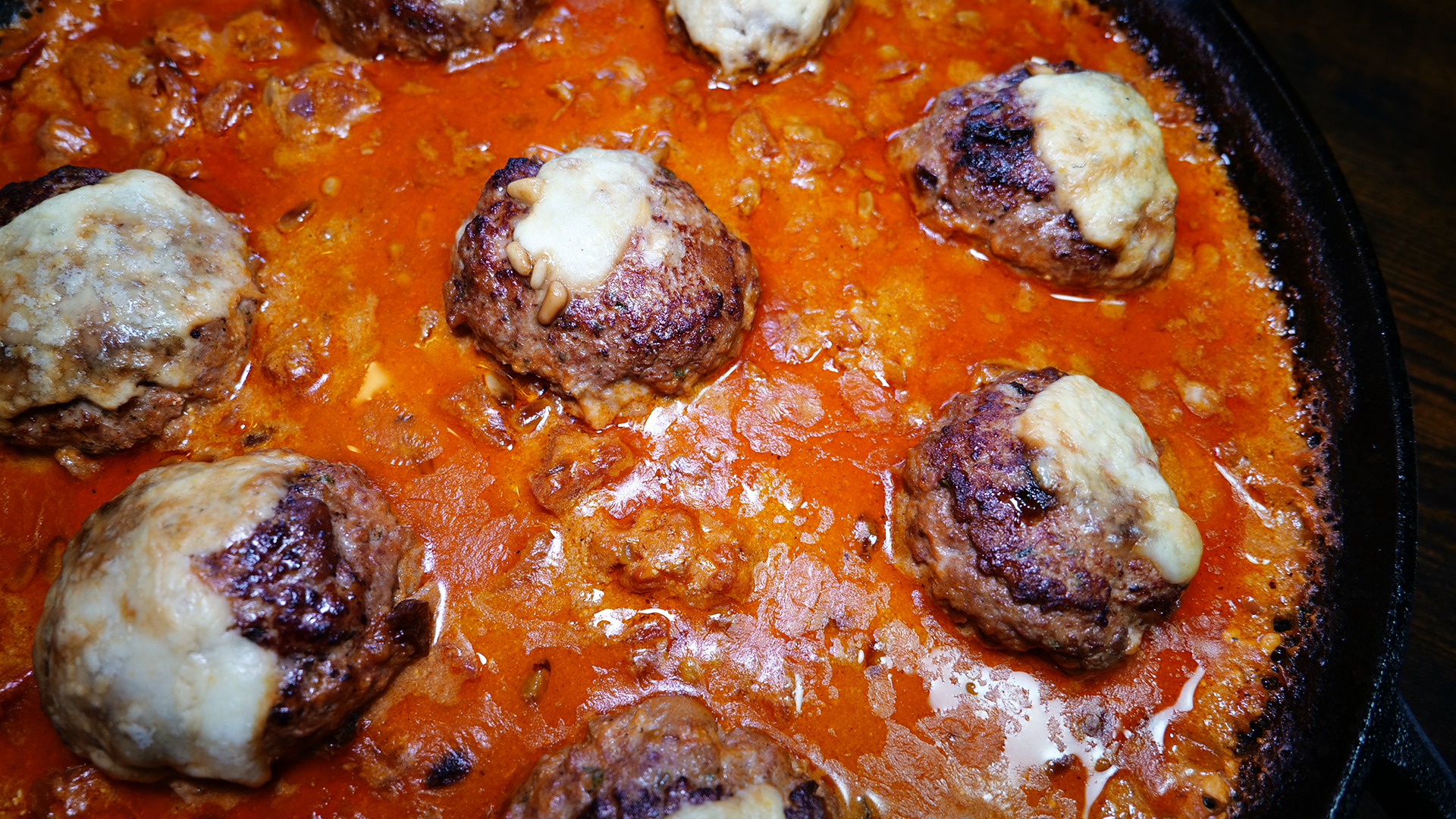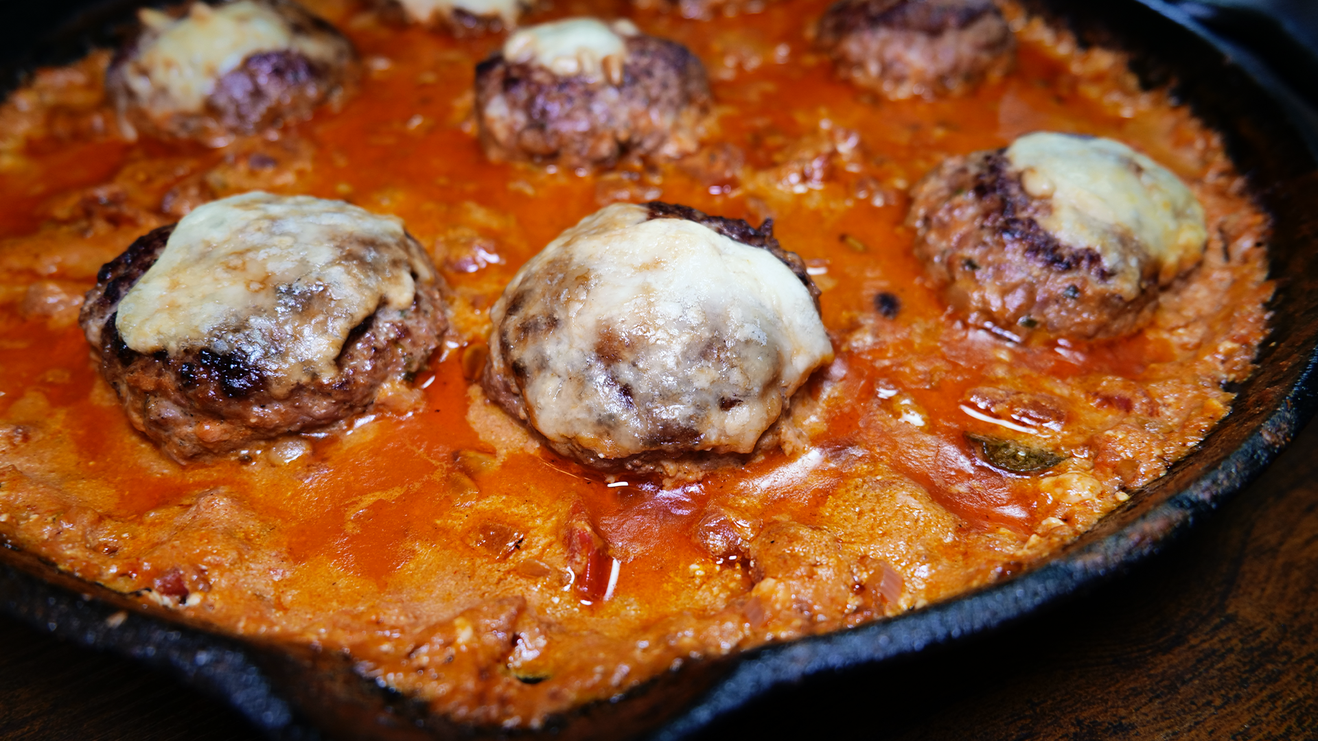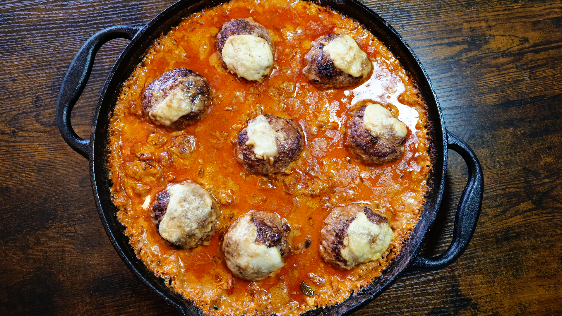 Die vorbereiteten Hackbällchen vorsichtig in die Soße setzen und leicht andrücken. Die in Portionen zerteilte Burrata gleichmäßig auf der Pfanne verteilen.