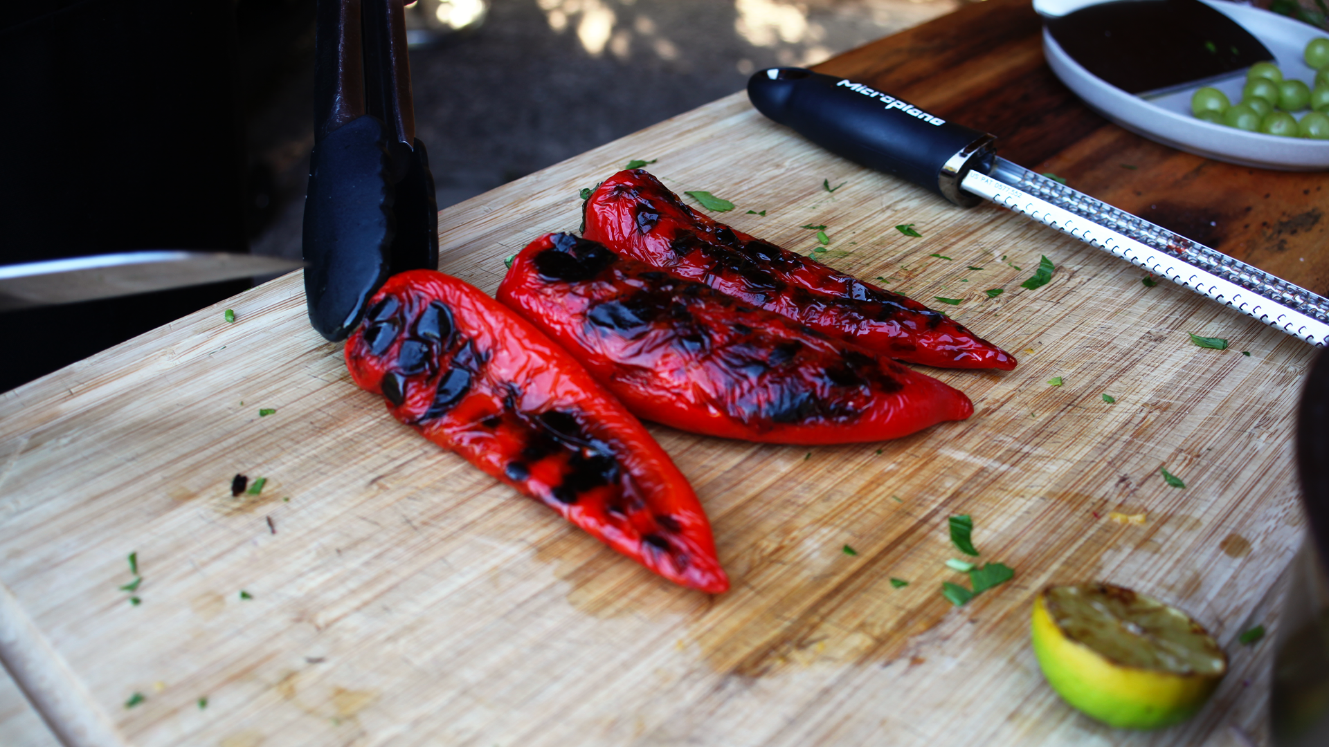 Lass die gegrillte Paprika abkühlen, ziehe die Haut ab und schneide sie in Würfel. Schneide die gegrillten Lauchzwiebeln in Ringe.