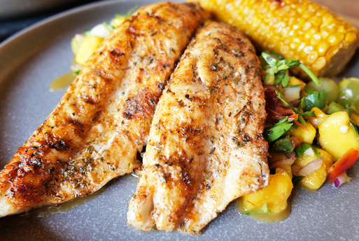 Zander vom Grill mit Mango-Salsa und Mais