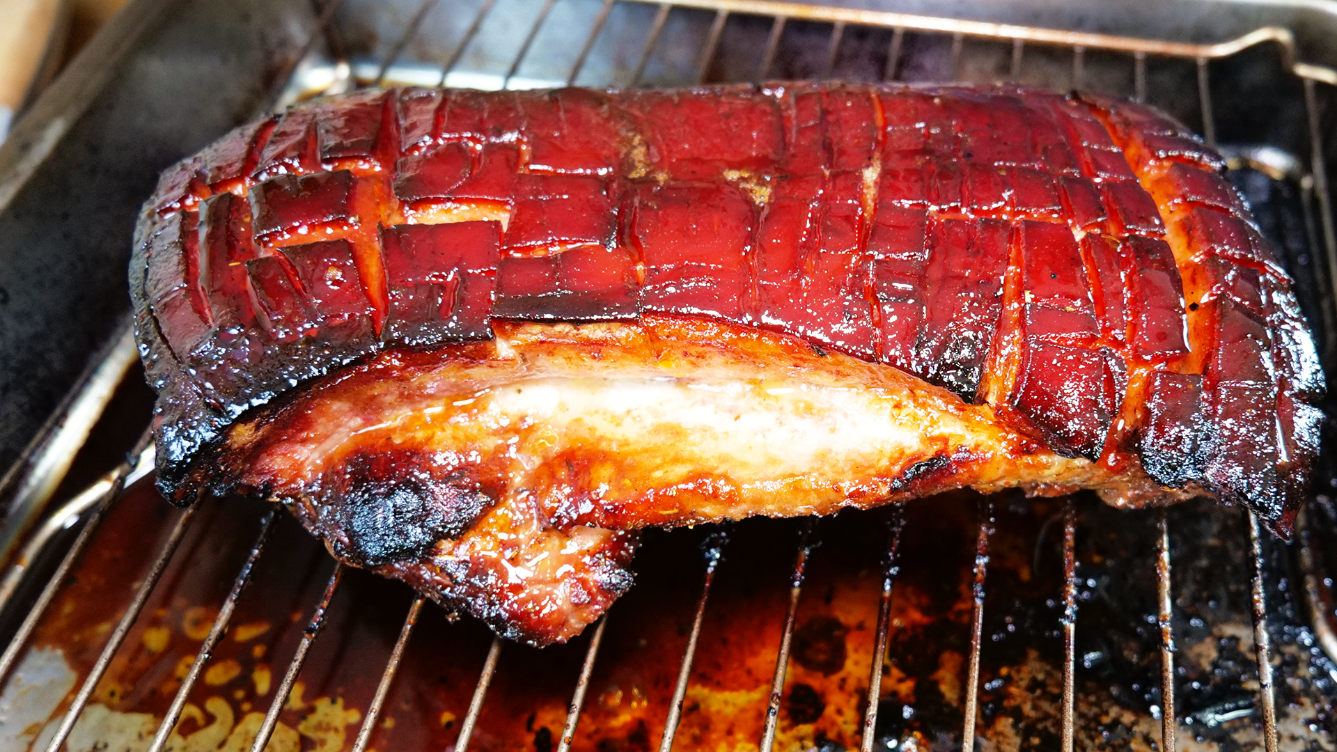 Optional die Schwarte am Ende direkt knusprig grillen (Vorsicht, verbrennt schnell) – oder mit einem Küchenbrenner knuspern.