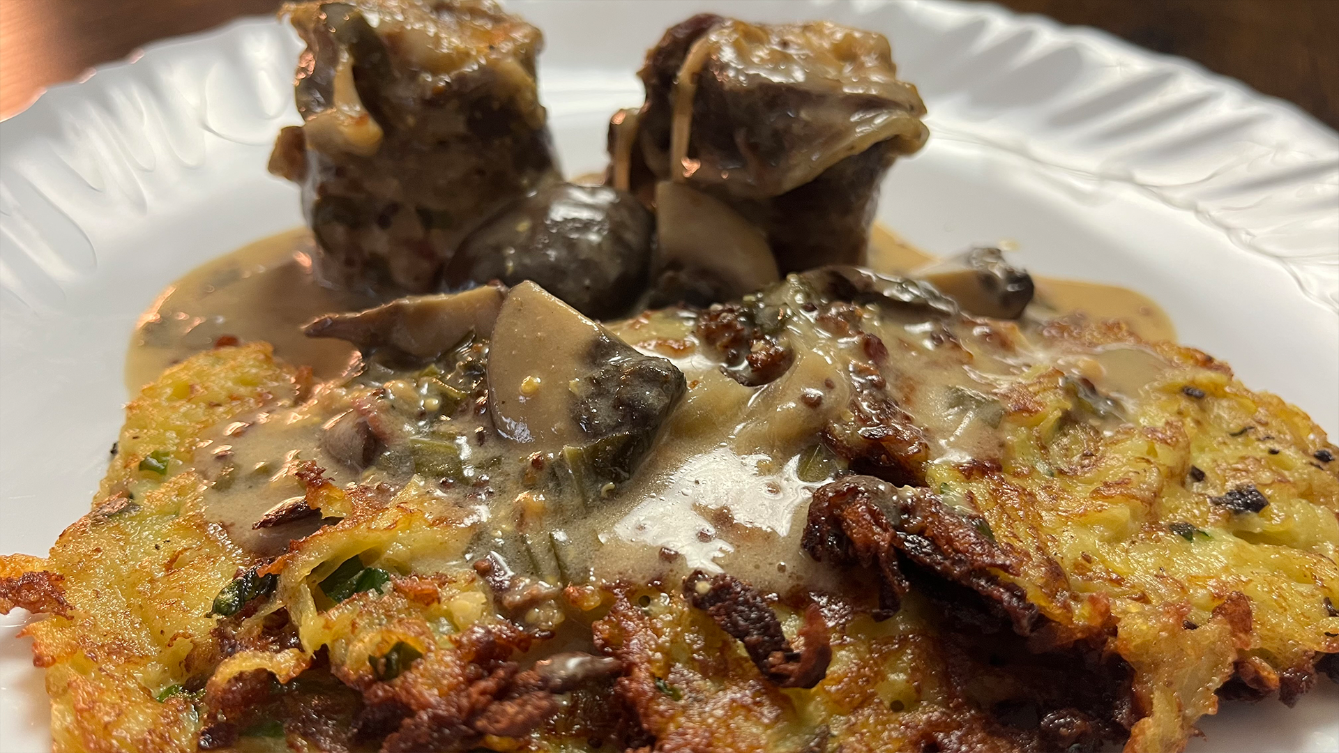 Für die Soße die Champignons klein schneiden. Butterschmalz in einer Pfanne auslassen. Die gewürfelten Zwiebeln darin anschwitzen, die Champignons gleich hinterhergeben. Wenn die Zwiebeln glasig sind, Mehl darüber sieben und kurz anrösten.