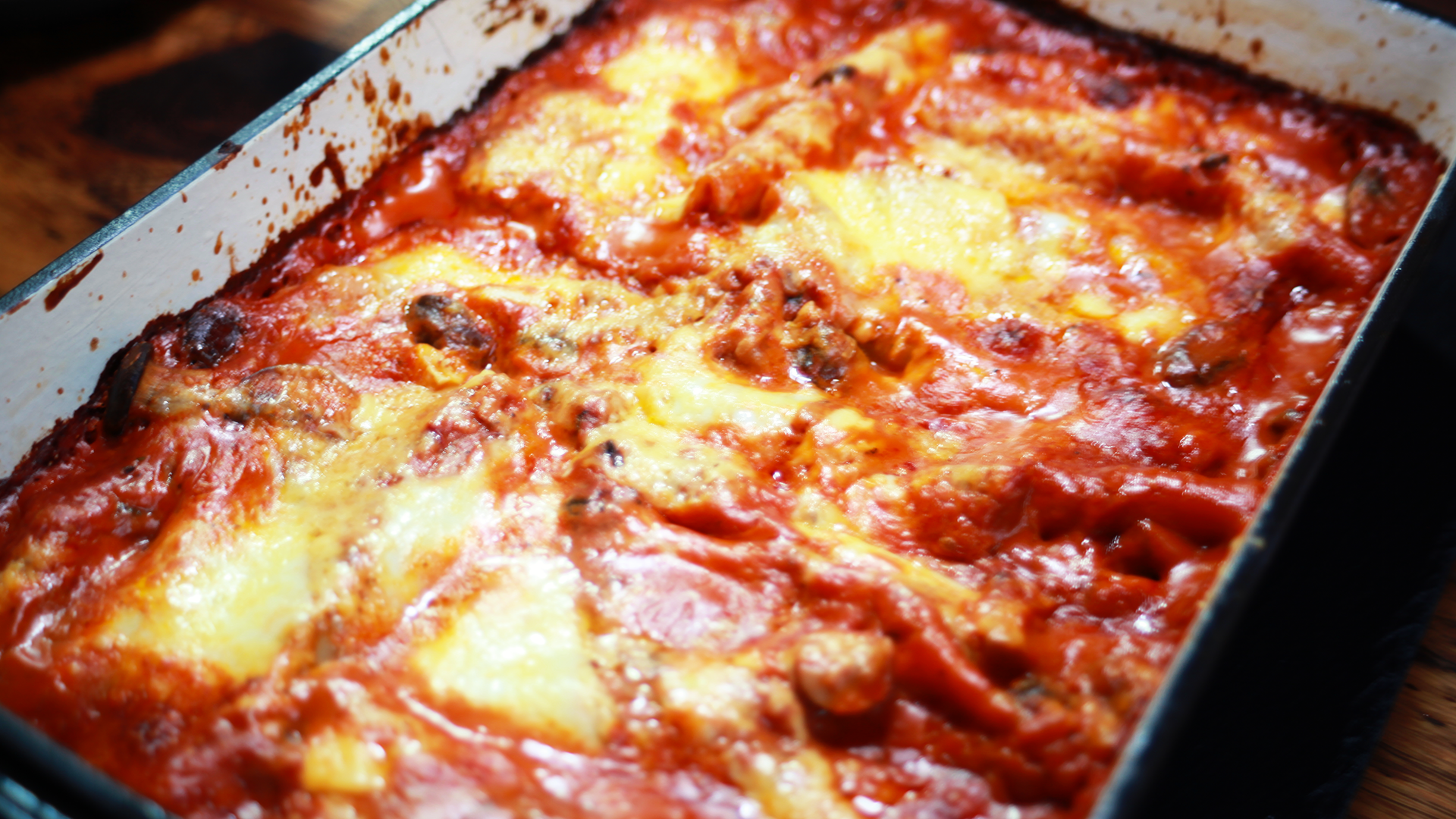 7. Mit Parmesan und optional Mozzarella bestreuen und bei 180 °C Umluft (200 °C Ober-/Unterhitze) ca. 35–40 Minuten goldbraun überbacken.