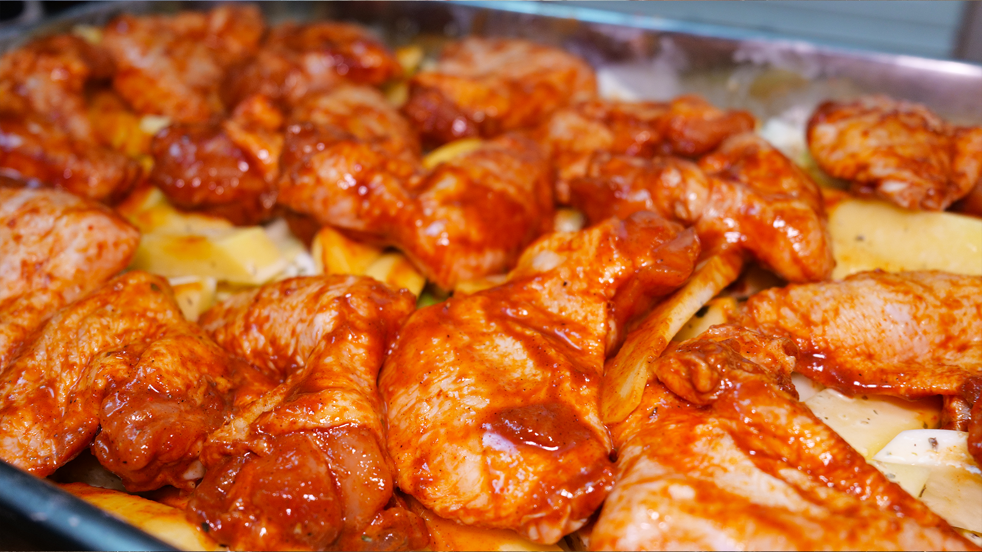 Die Garzeit kann je nach Dicke der Wings und gewünschter Knusprigkeit variieren. Das Fleisch sollte durchgegart und die Kartoffeln weich und leicht gebräunt sein.