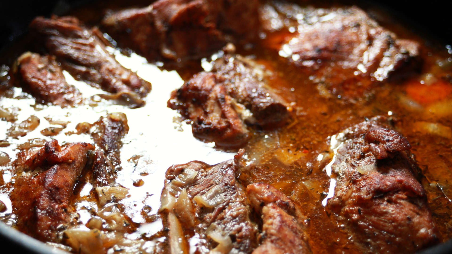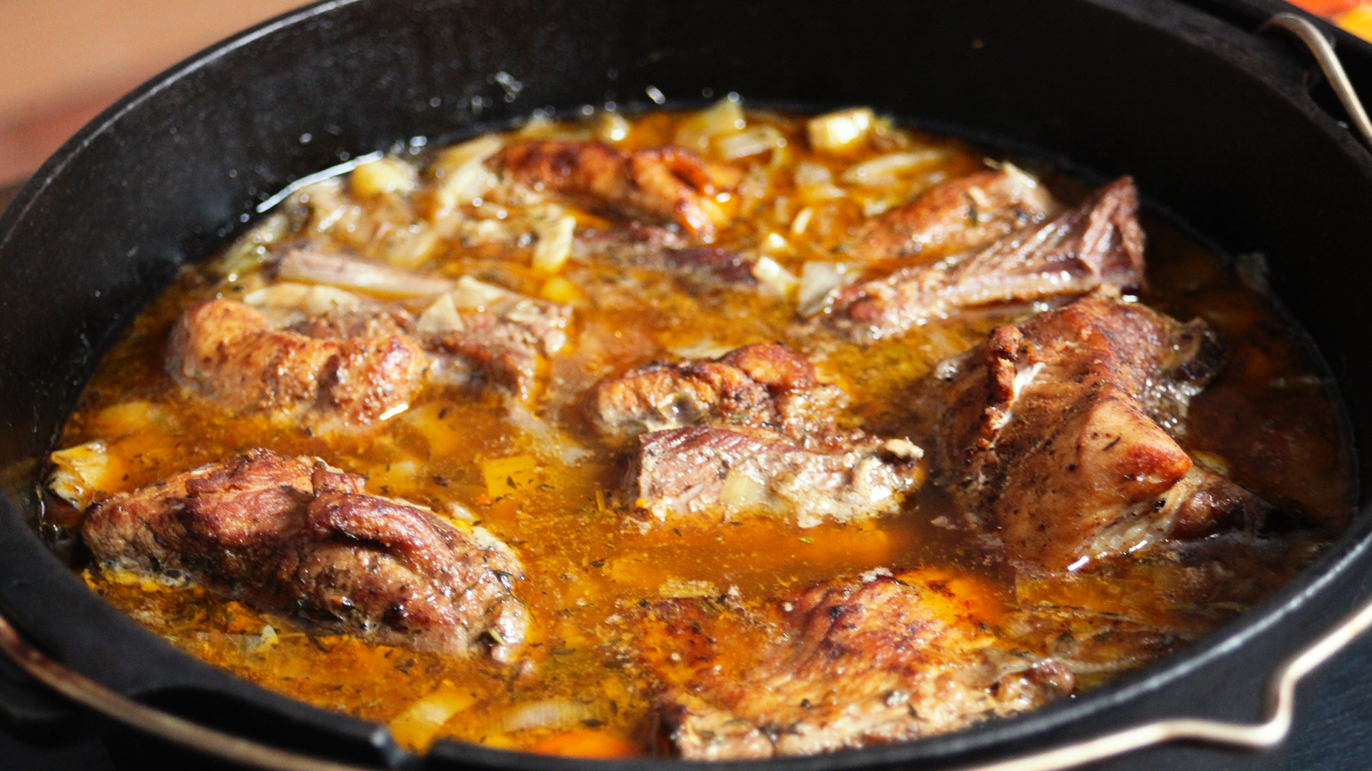 3. Fleisch auf das Gemüse legen. Deckel schließen. 2 Stunden bei 160–170°C schmoren (Kamado, Backofen oder Glut). Letzte 20–30 min den Deckel leicht öffnen, damit die Soße einreduziert. Fertig, wenn das Fleisch weich ist und sich gut lösen lässt.