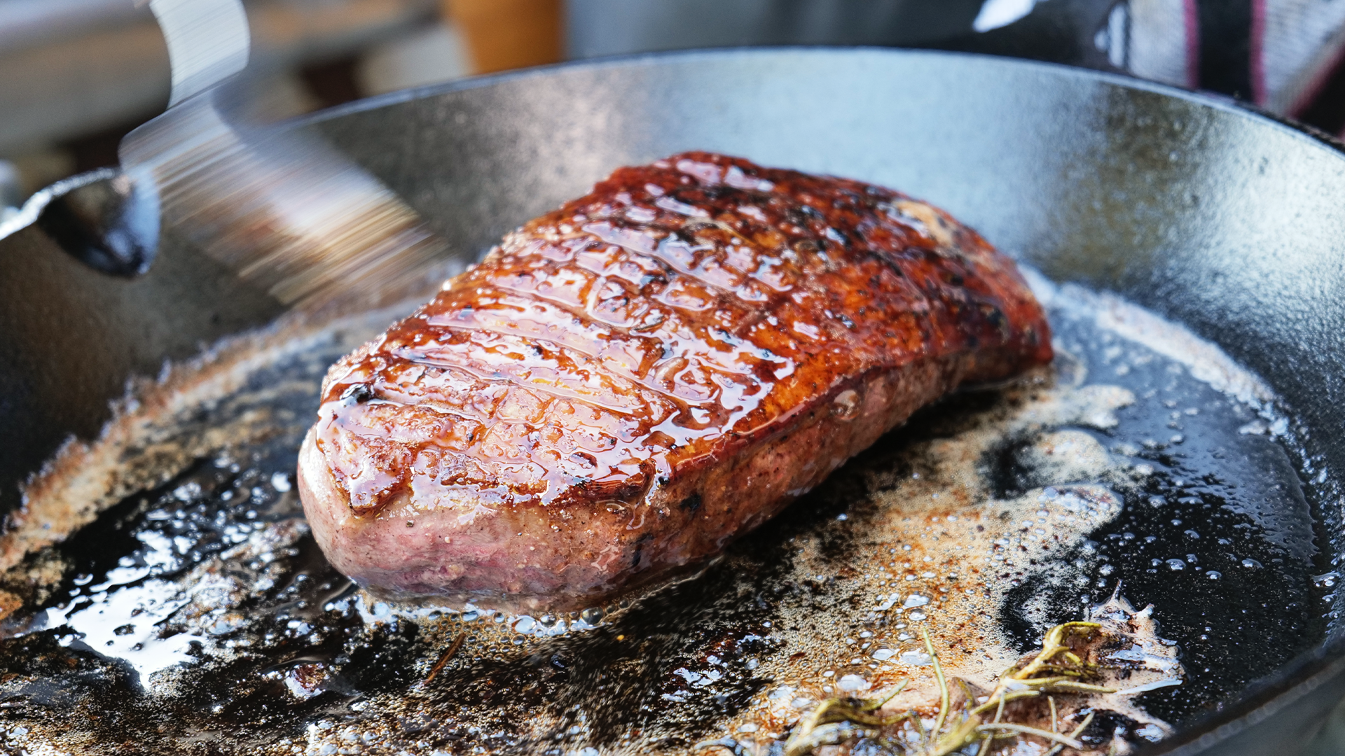 3. Wenn die Haut schön knusprig ist, Entenbrust wenden und mit einer Flocke Butter arrosieren – also wiederholt mit der heißen Butter übergießen.