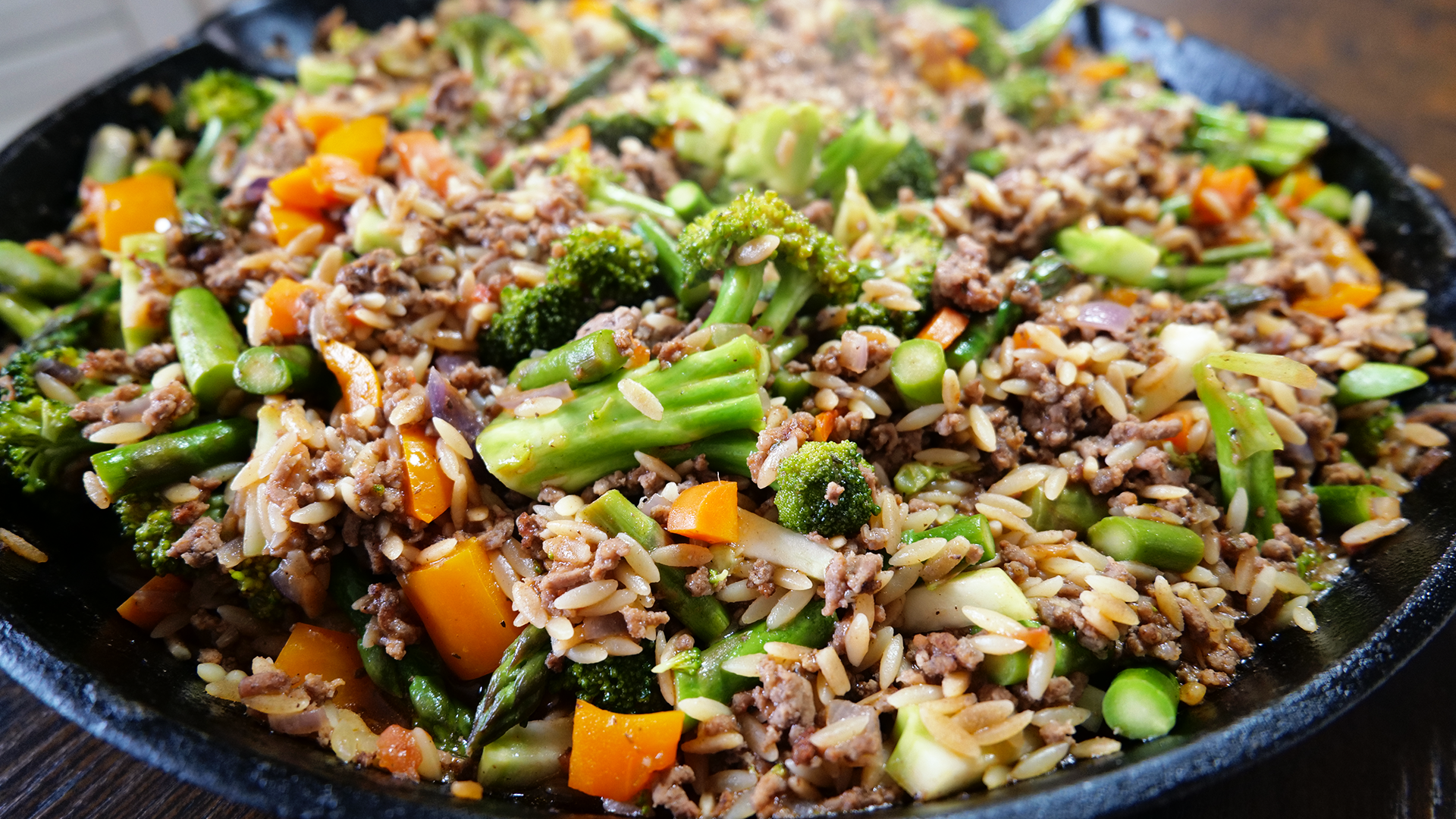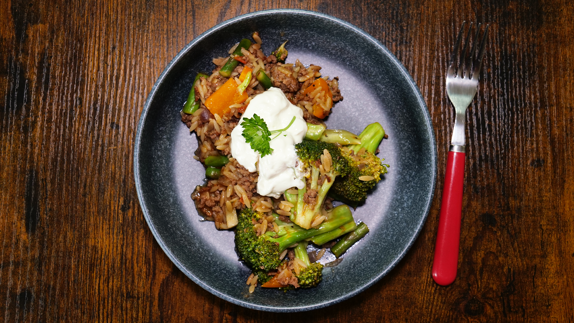 Griechische Hackfleisch-Gemüsepfanne mit Reisnudeln
