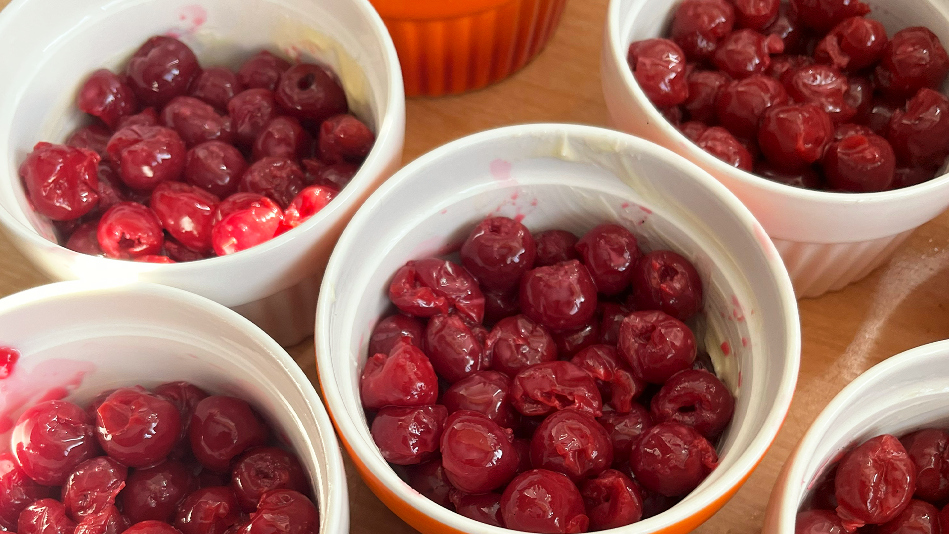 2. Vermische diese Flüssigkeit dann mit den abgetropften Kirschen und verteile die Füllung gleichmäßig auf 10 Soufflé-Förmchen.