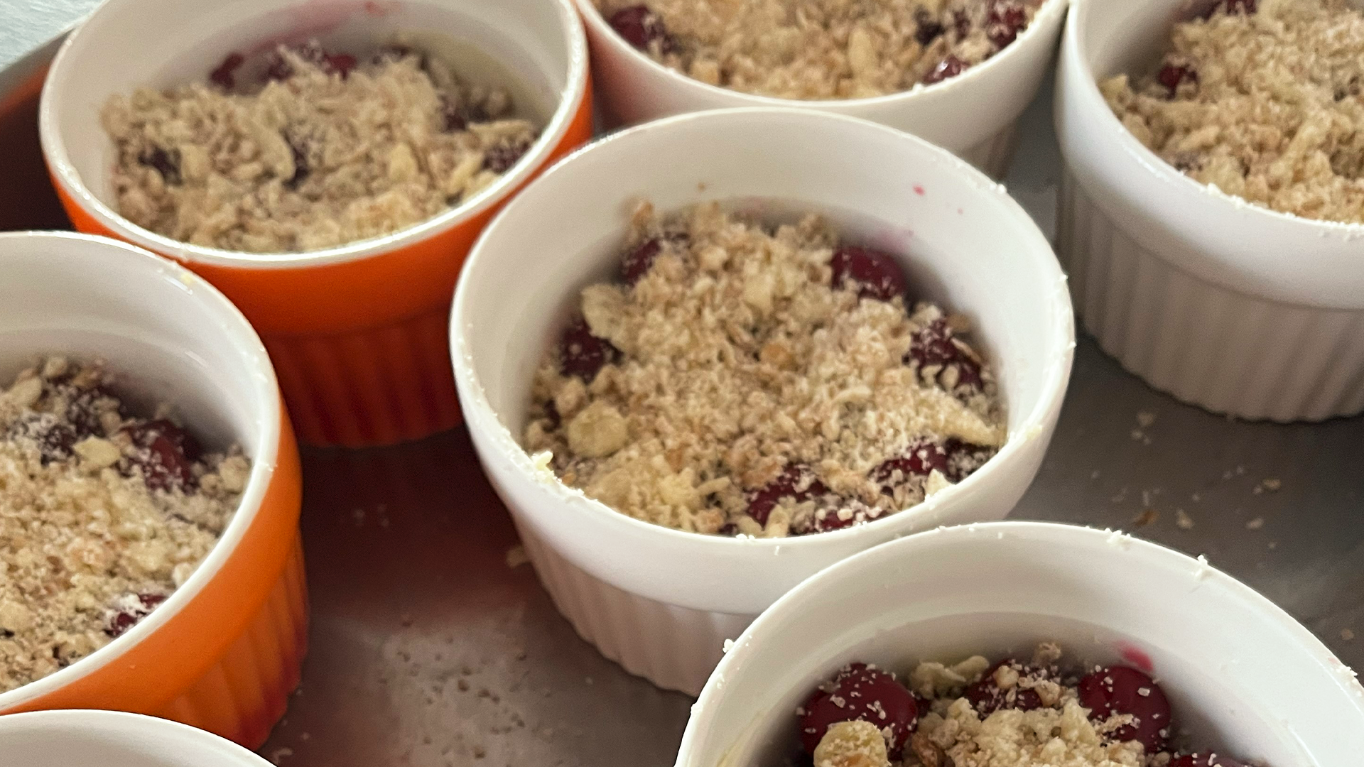 4. Verteile die Streusel gleichmäßig über die Kirschen in den Förmchen.