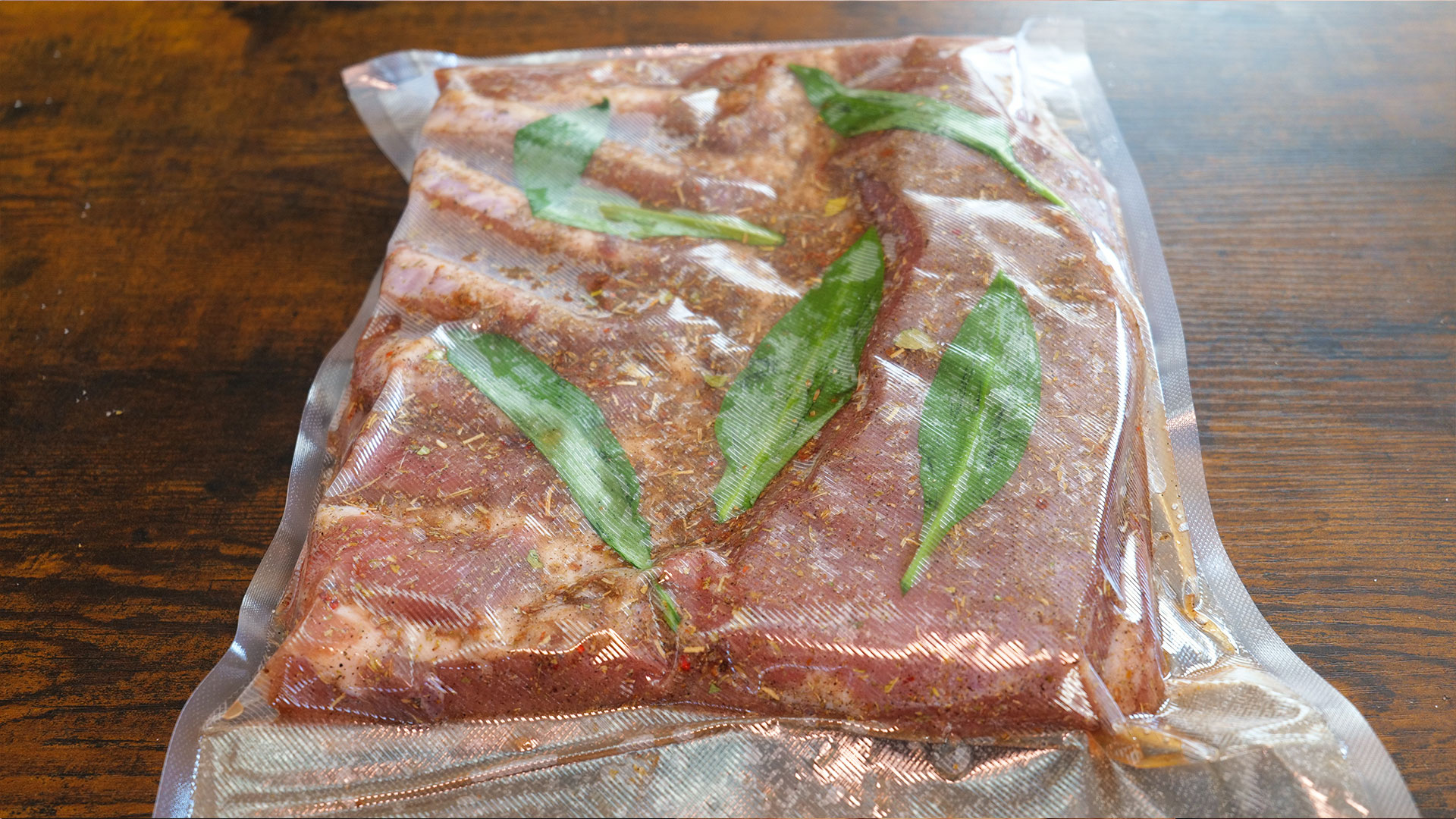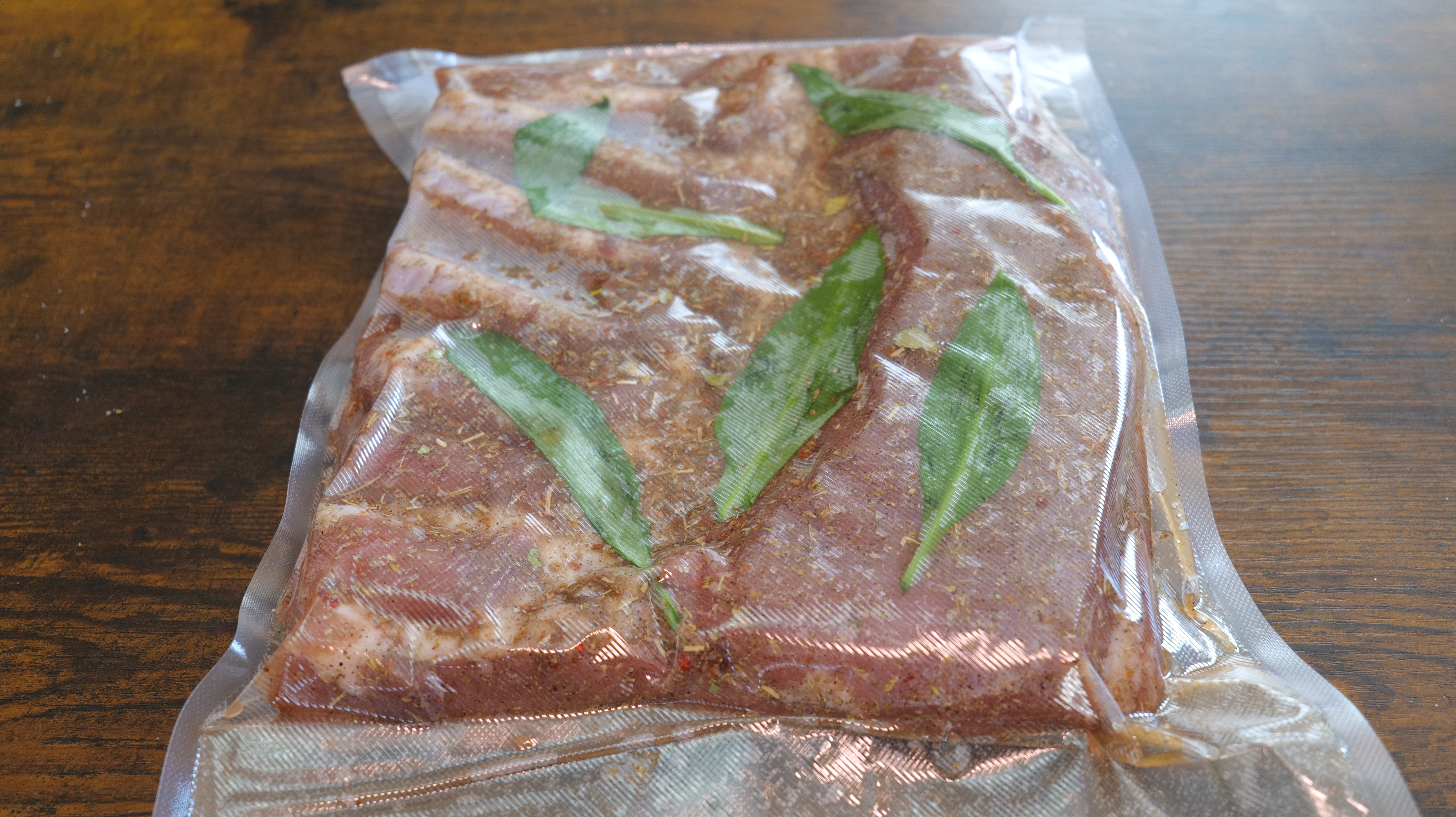Die Bärlauchblätter auf den Bacon legen, vakuumieren, und ab in den Kühlschrank für 1 Woche.