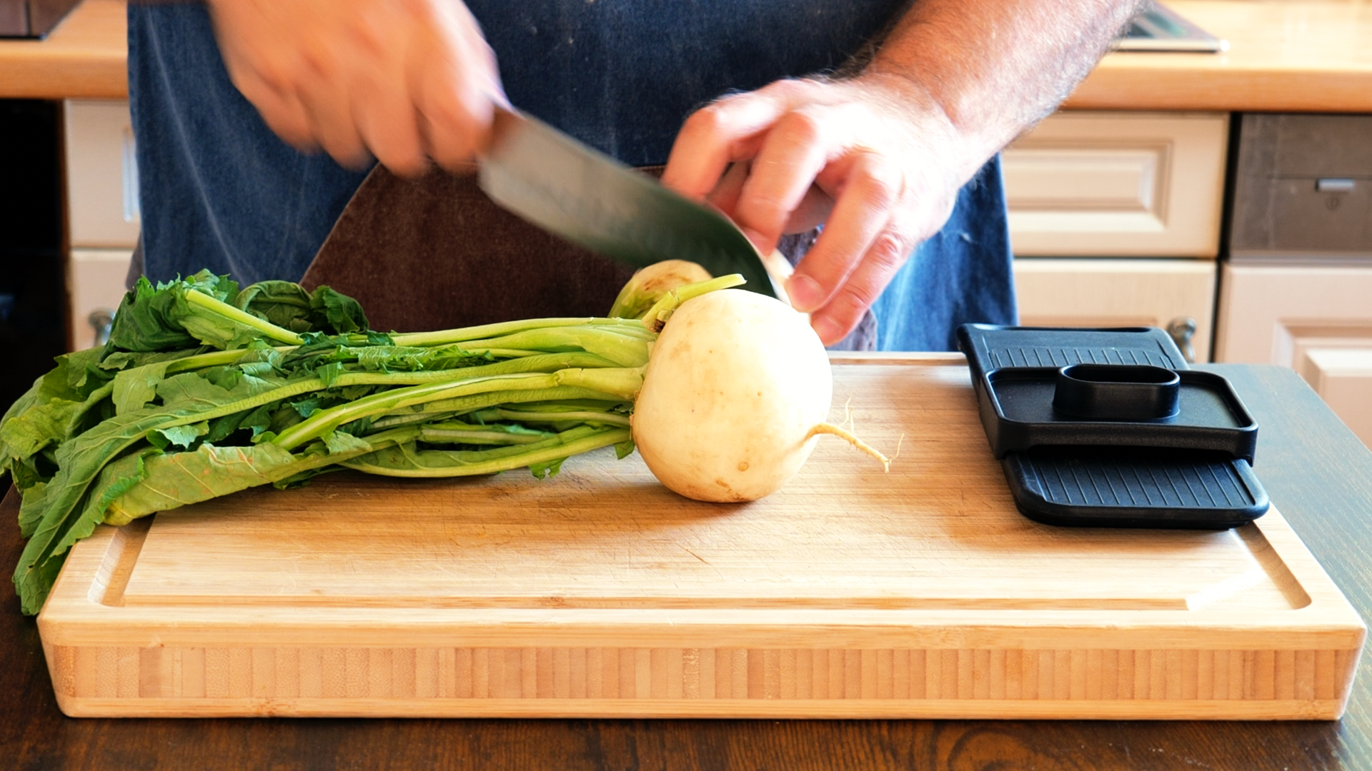 Wasche die Mairüben gründlich und schneide sie erst in 3 mm Scheiben und dann in feine Stifte. Die dünne Schale kannst du dranlassen, da sie sehr zart ist. Schäle die rote Zwiebel und schneide sie ebenfalls in feine Scheiben.