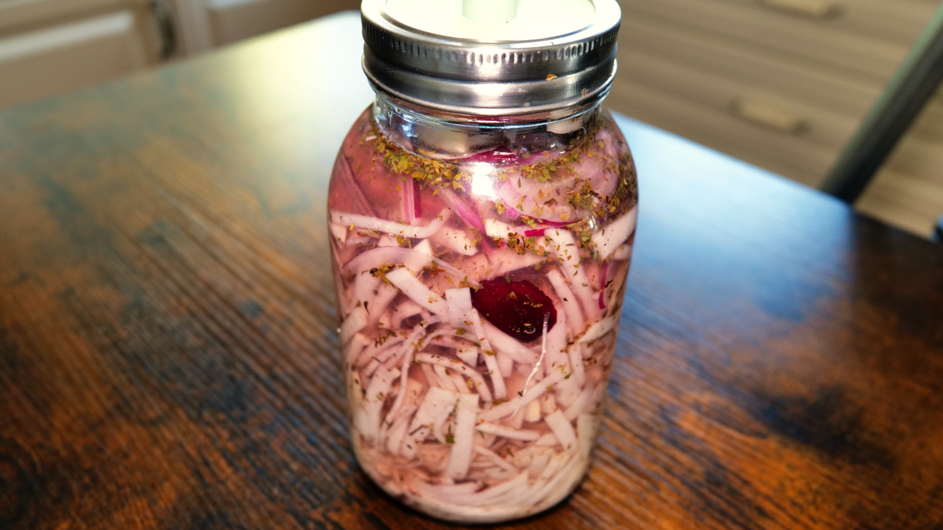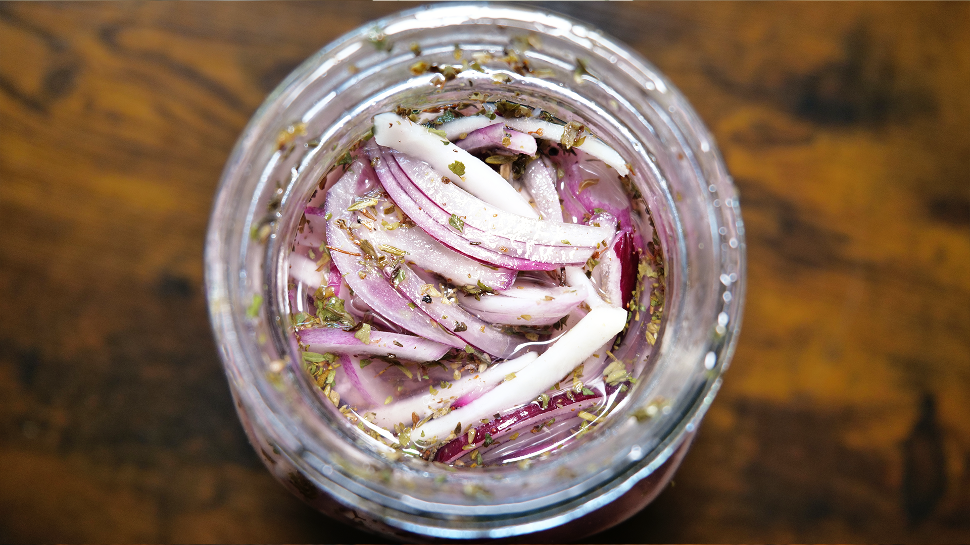 Gib die vorbereiteten Mairübenstifte und Zwiebelscheiben in ein ausreichend großes Glas mit Schraubverschluss (z.B. ein Einmachglas oder großes Marmeladenglas).