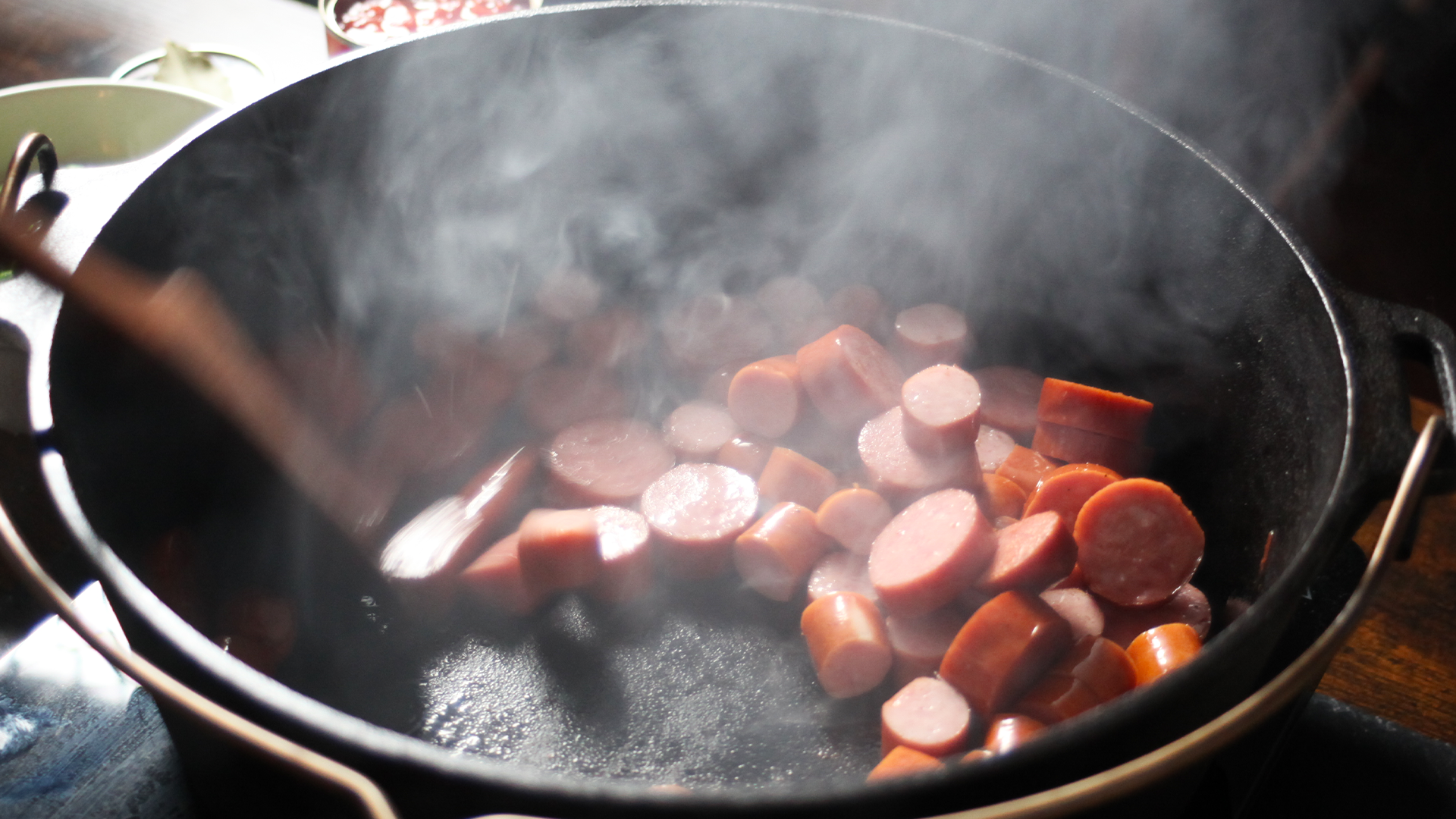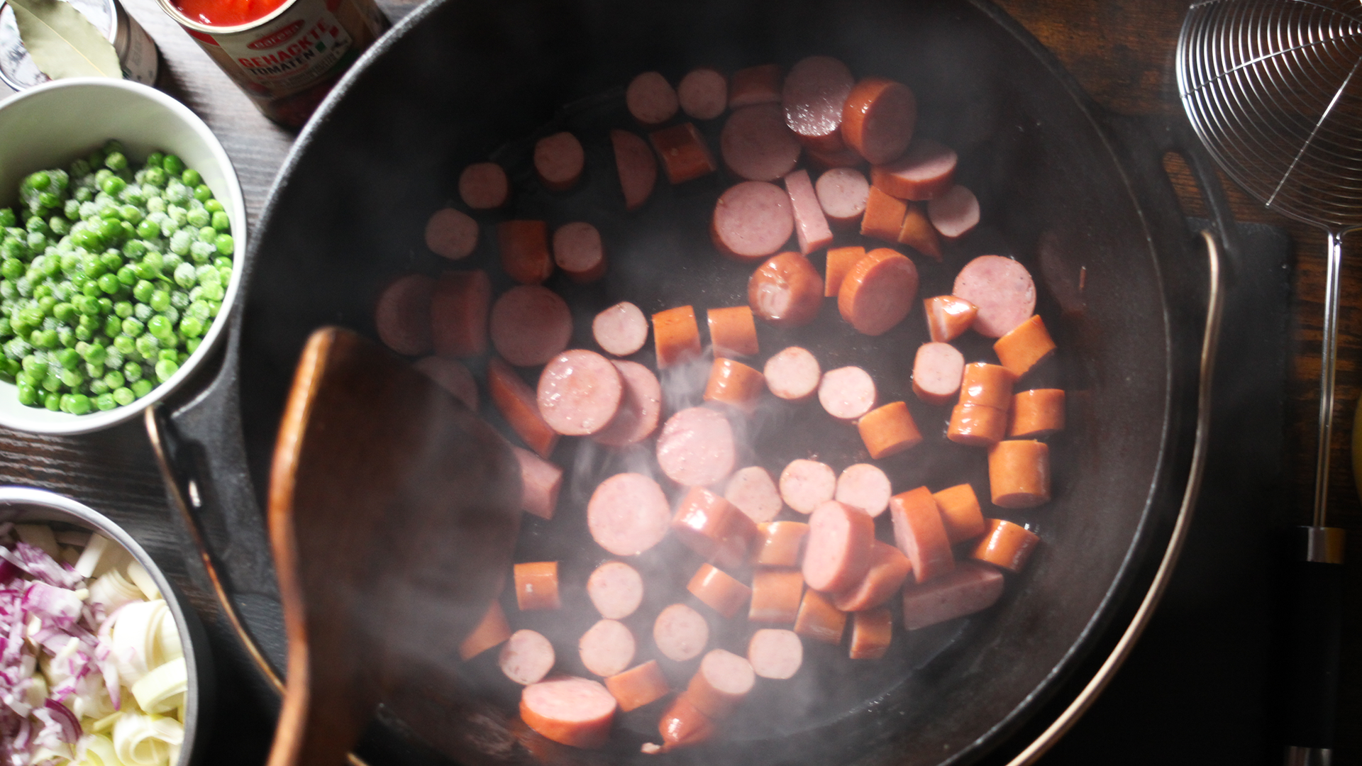 2. Anrösten: Öl oder Butterschmalz im Dutch Oven erhitzen. Wurstscheiben scharf anbraten, herausnehmen und beiseitestellen.