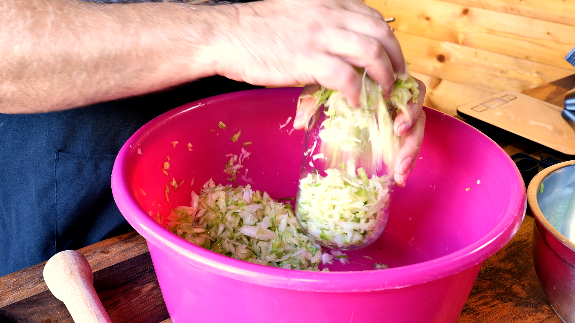 2. Mit 2% Salz (20 g pro 1 kg Kohl) bestreuen. Kräftig durchkneten, bis viel Saft entsteht.