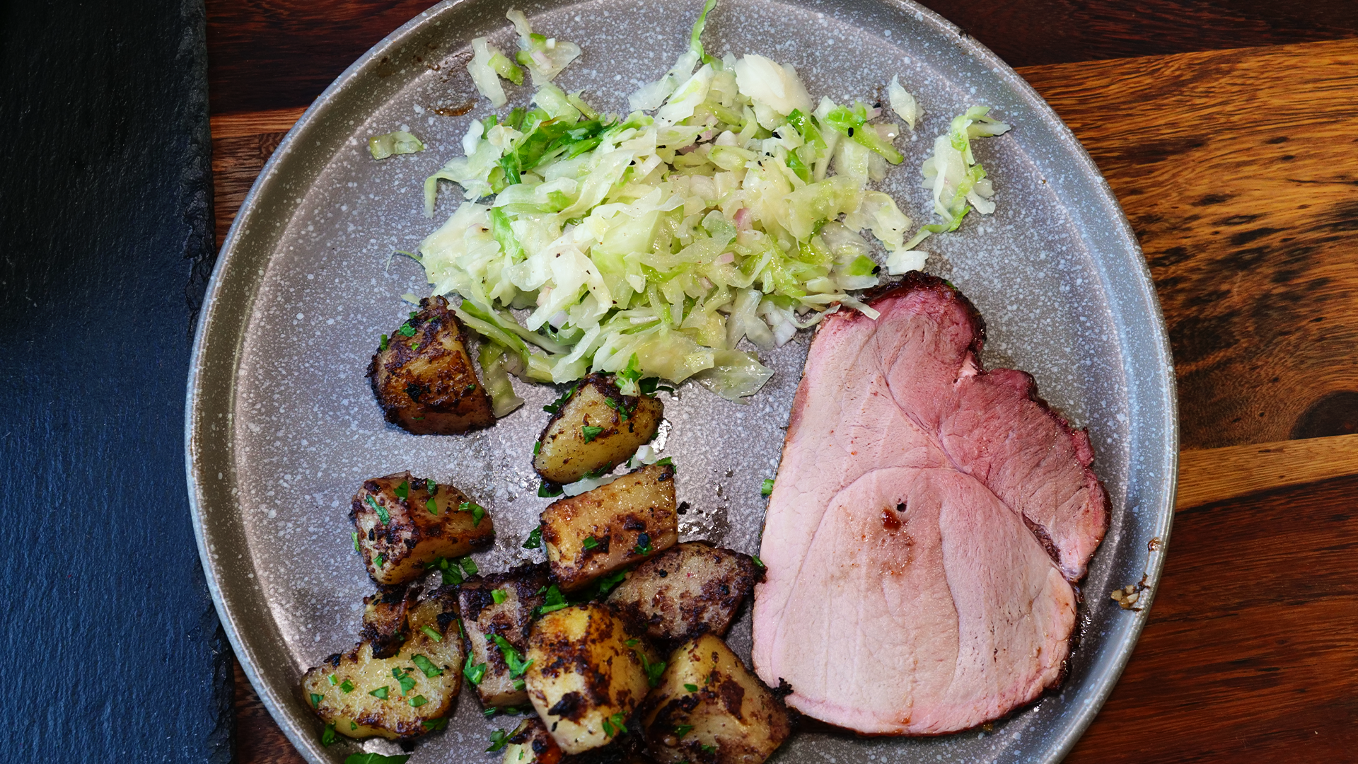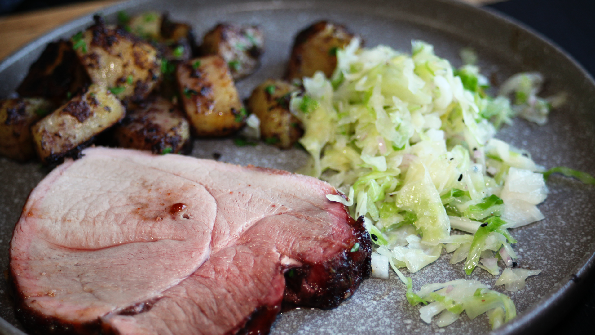 In Scheiben schneiden, mit Glasur beträufeln, dazu Kartoffeln & Krautsalat reichen.
