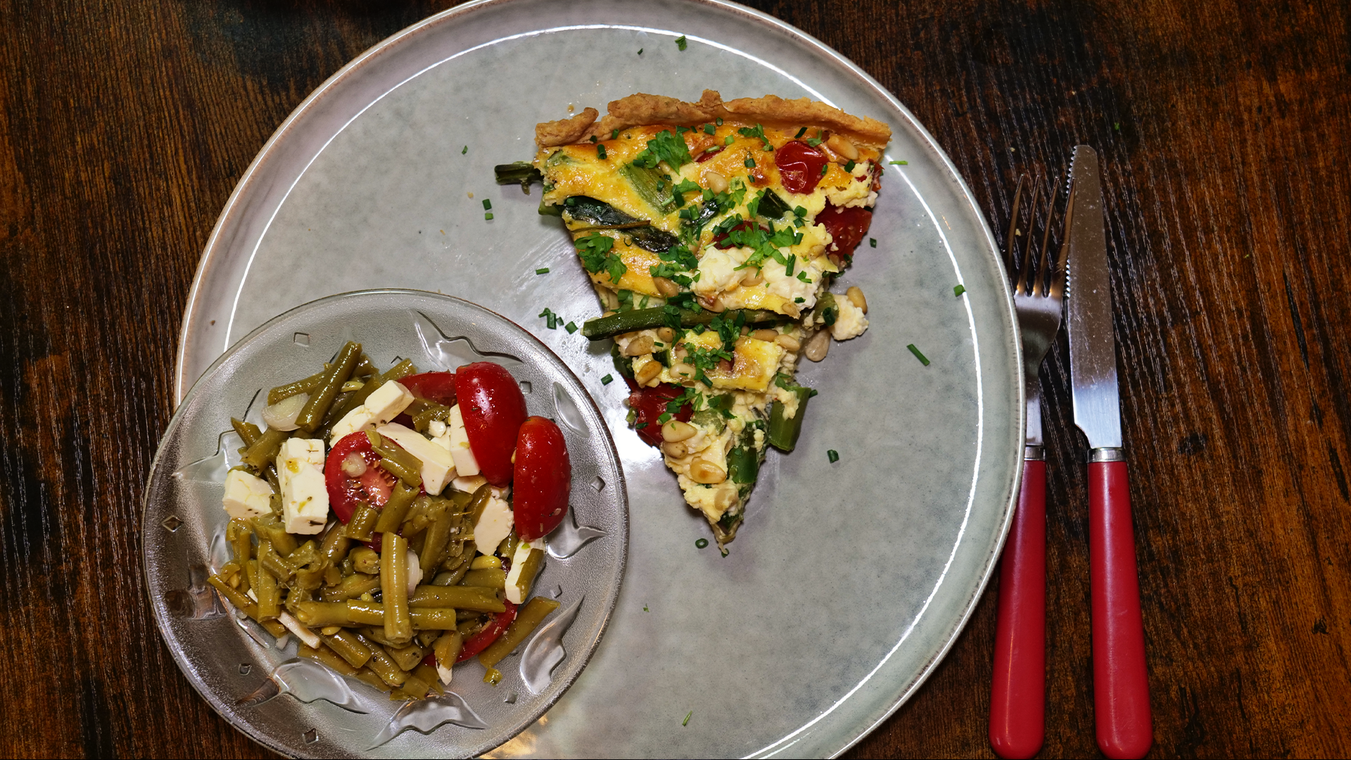 Die Quiche schmeckt lauwarm oder kalt am besten, zum Beispiel mit einem frischen Frühlingssalat und einem Glas Weißwein.